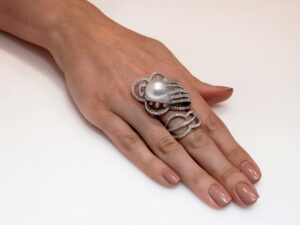 Στην επόμενη φωτογραφία της, επέλεξε ένα πολύτιμο δαχτυλίδι σε πιο επίσημο ύφος με ένα κεντρικό, ευμέγεθες Μπαρόκ Μαργαριτάρι Νοτίων Θάλασσων στολισμένο με Διαμάντια σε κοπή Μπριγιάν σεταρισμένο με λευκό χρυσό 18Κ.