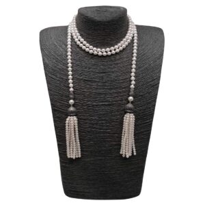 Η Κα. Πρεζεράκου διάλεξε ένα κλασσικό λουκ με ένα πανέμορφο κολιέ από μαργαριτάρια σε στυλ φούντες αποτελούμενο από Μαργαριτάρια Ακόγια Ιαπωνίας και Λευκά Διαμάντια σε κοπή μπριγιάν. Ακόμα, φοράει ένα υπέροχο, λαμπερό κολιέ με το κεντρικό Μαργαριτάρι να είναι Νοτίων Θάλασσων δεμένο με λαμπερά διαμάντια σε κοπή μπριγιάν και τα υπόλοιπα Μαργαριτάρια να είναι κατάλευκα, λαμπερά Μαργαριτάρια Ακόγια Ιαπωνίας.