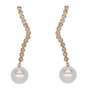 Γνωστή για το λιτό και απέριττο στυλ της και τη διακριτική πολυτέλεια που αποπνέει, η Κα. Καγιά διάλεξε ένα γραμμικό σχέδιο σκουλαρικιών με πολύτιμα Μαργαριτάρια Νοτίων Θαλασσών και λευκά διαμάντια σε γραμμική στοίχιση, σεταρισμένα σε 18Κ κίτρινο χρυσό.