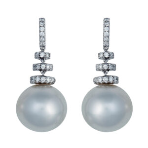 Η μητέρα της κας. Καγιά, Αλεξάνδρα, ακολούθησε την συνταγή της μοναδικής Βίκυς, και διάλεξε ένα επίσης μίνιμαλ σχέδιο σκουλαρικιών με λευκά διαμάντια σε σπείρα που καταλήγουν σε πανέμορφα και λεία Μαργαριτάρια Νοτίων Θαλασσών.