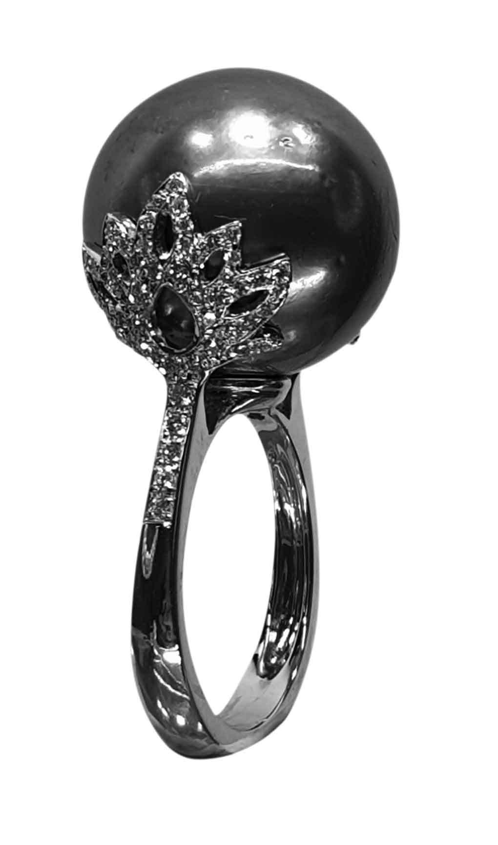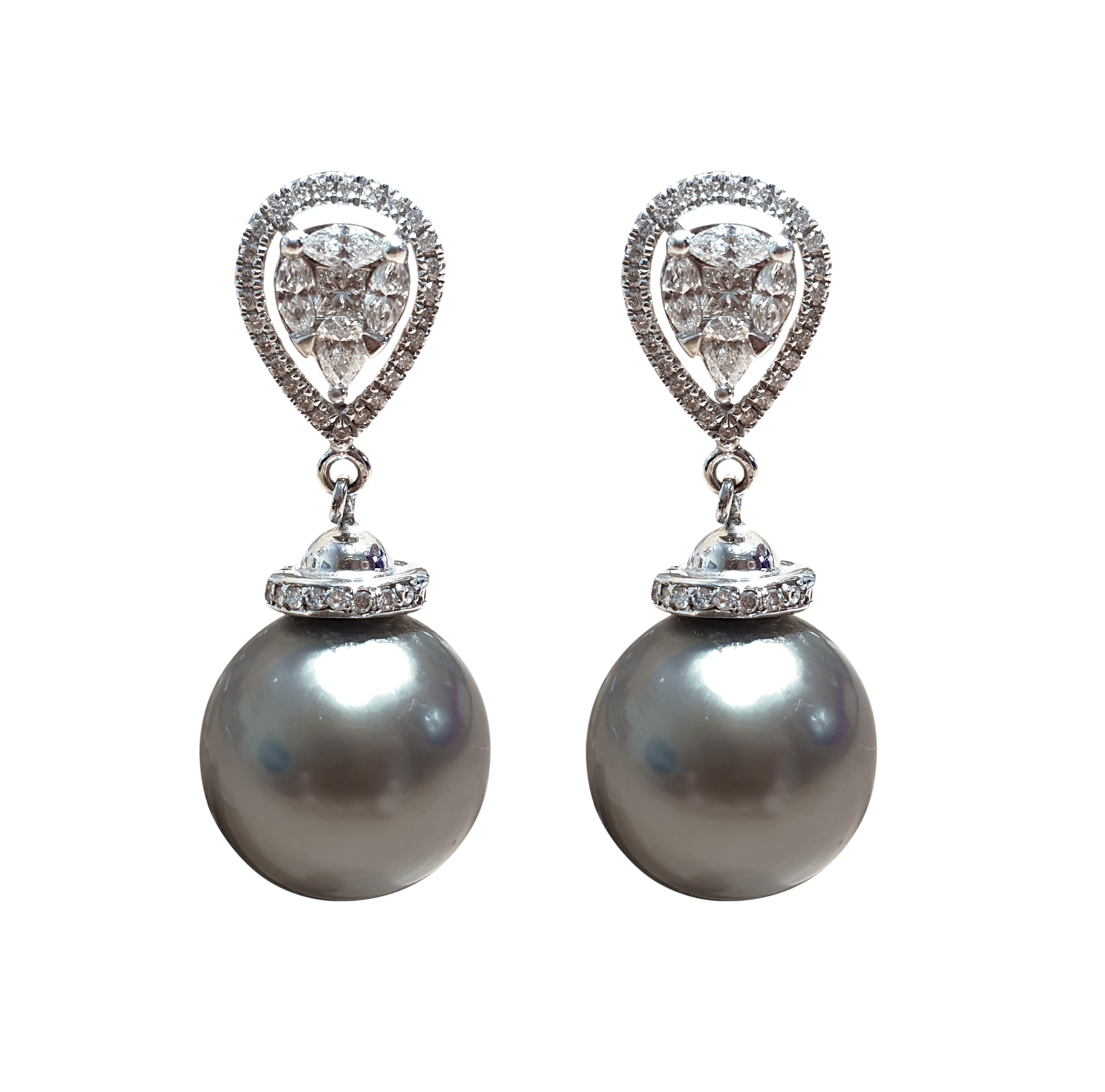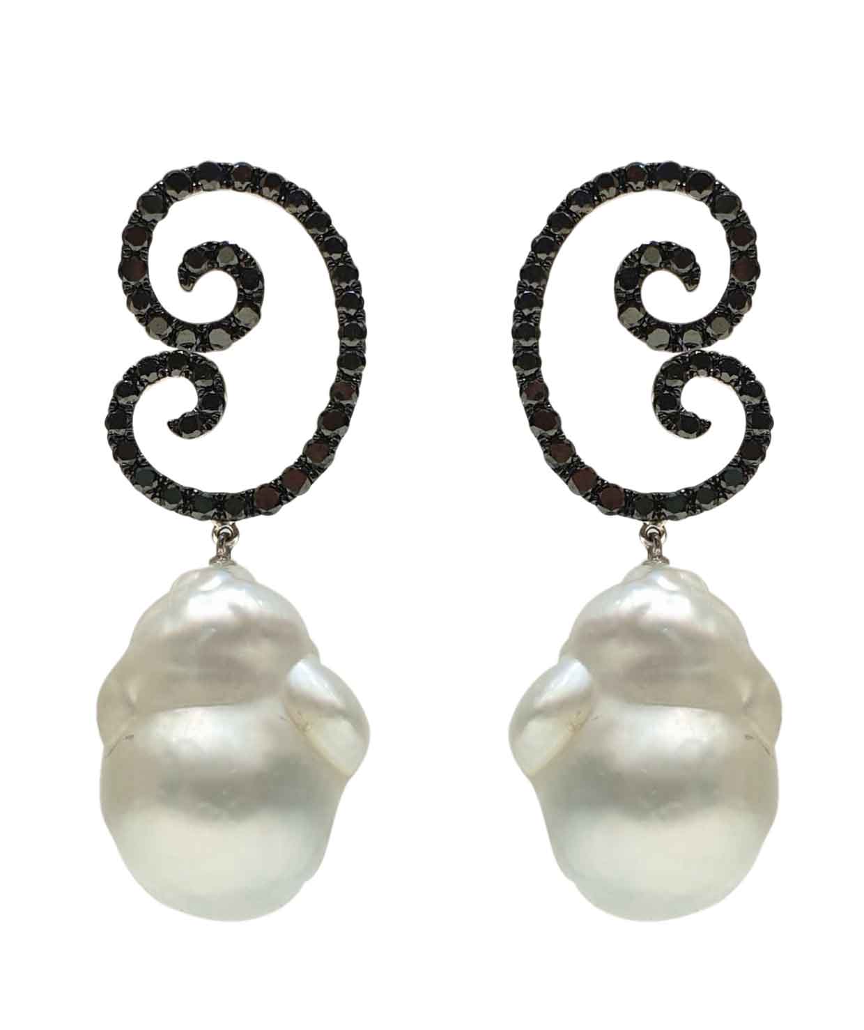 Ένα ζευγάρι σκουλαρίκια με Μπαρόκ μαργαριτάρια νοτίων Θαλασσών με μαύρα διαμάντια σε λευκό χρυσό 18 καρατίων μαζί με ένα δαχτυλίδι λευκό χρυσό 18 καρατίων με λευκά διαμάντια και μαύρο μαργαριτάρι Ταϊτής.