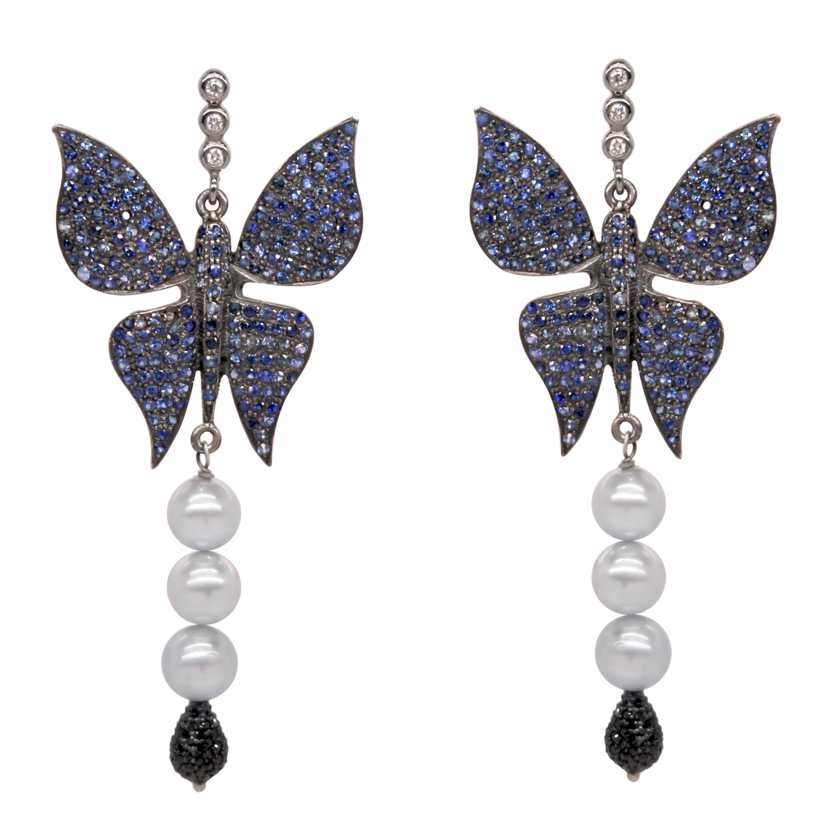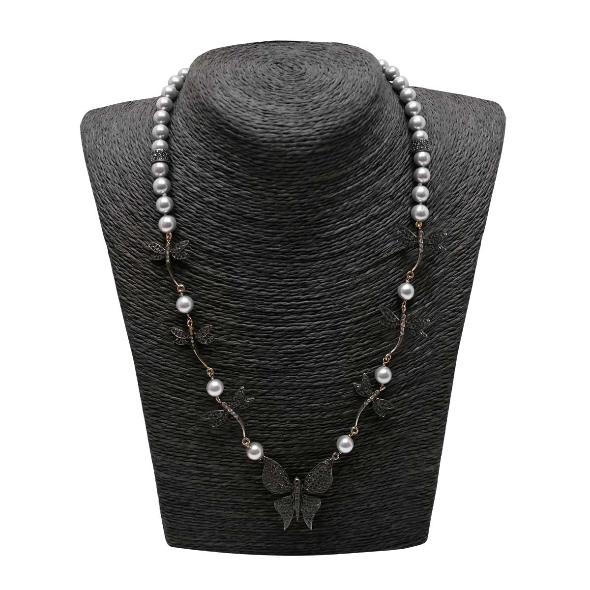 Η Νικολέτα Κοτσαηλίδου φοράει ένα κολιέ σε ροζ χρυσό με γκρίζα μαργαριτάρια, λευκά διαμάντια και ζαφείρια και ένα ζευγάρι σκουλαρίκια σε ροζ χρυσό με γκρίζα μαργαριτάρια, λευκά διαμάντια και ζαφείρια