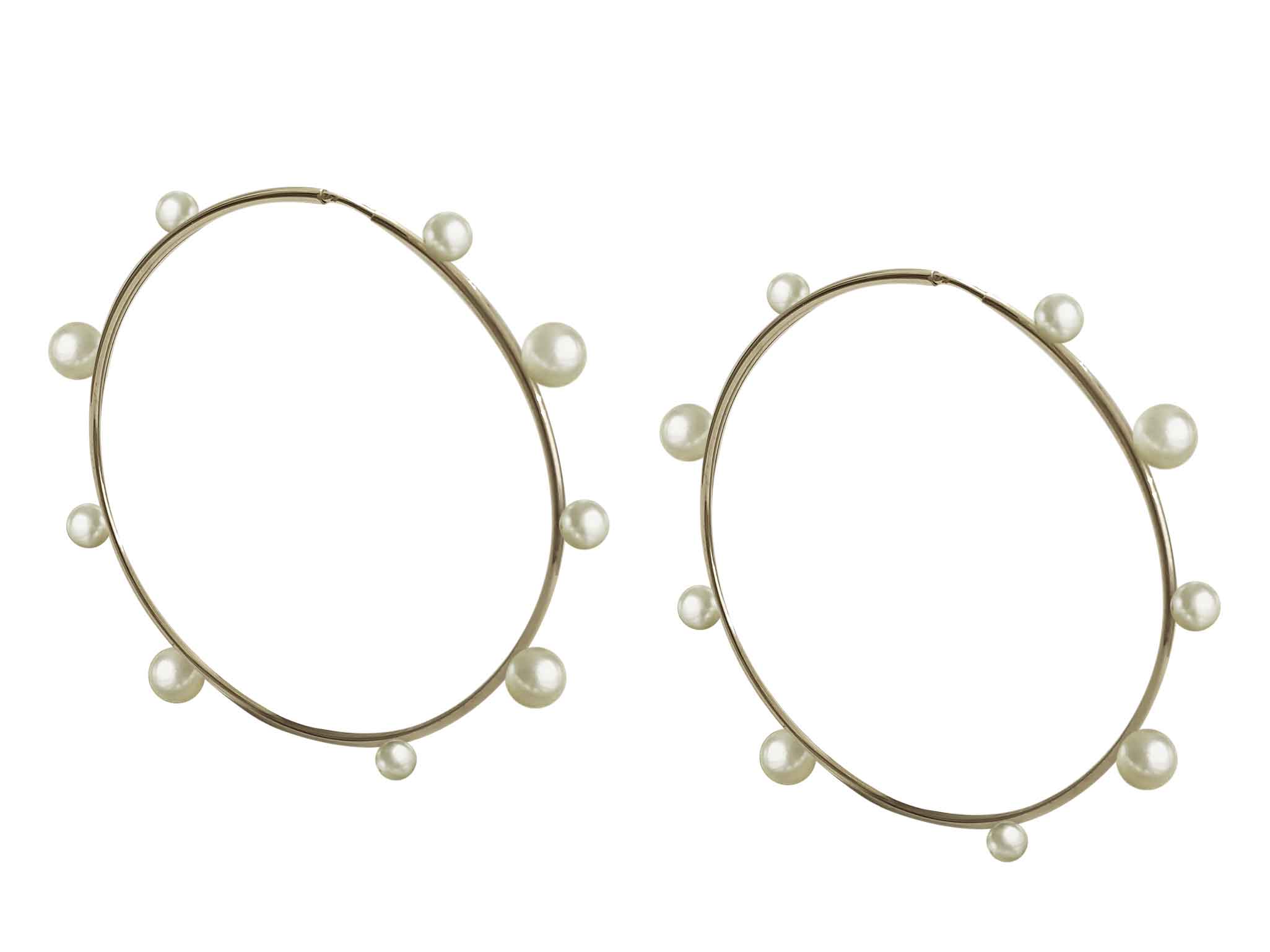 Η Μαρία Πετεβη φοράει ένα ζευγάρι μοντέρνους κρίκους σε λευκό χρυσό και Ακόγια Μαργαριτάρια.