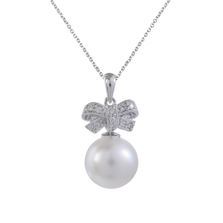 A dainty bow design pendant with gorgeous brilliant cut diamonds and a glossy South Sea pearl set in 18K white gold.