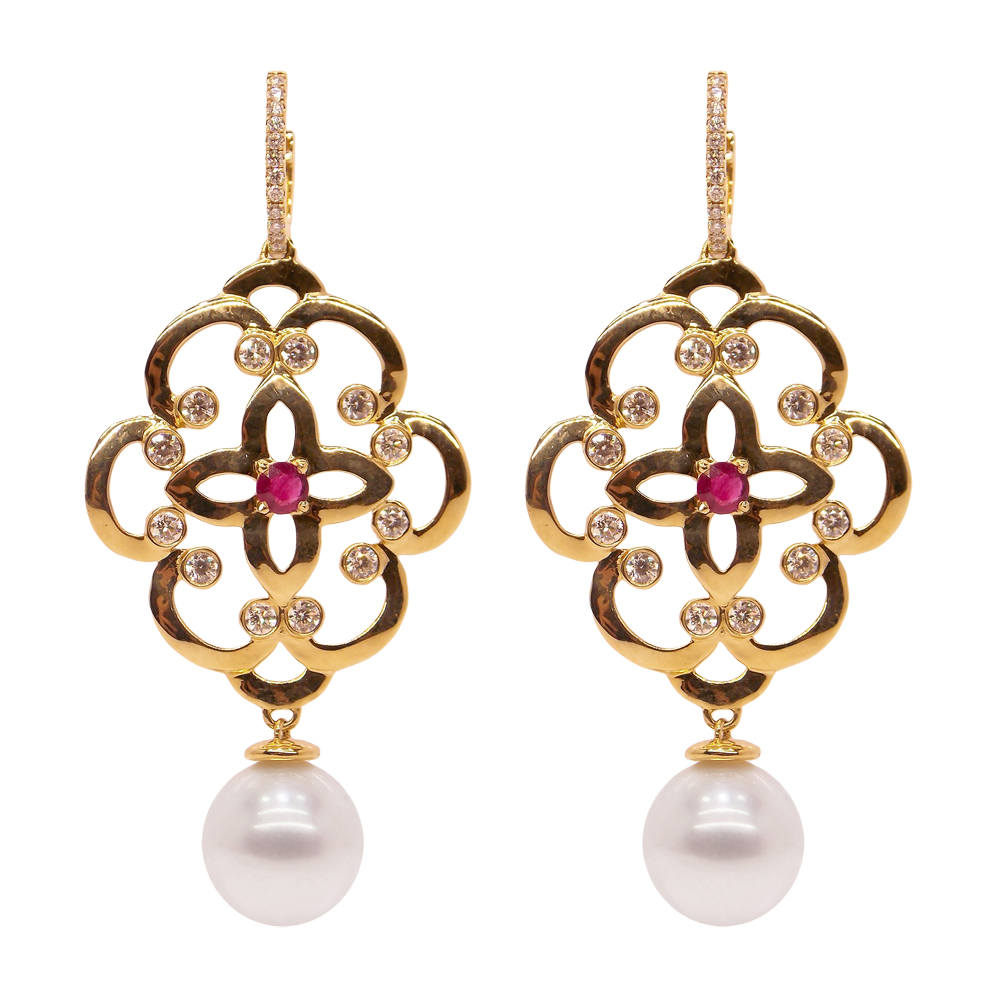 Indian influence earrings set in 18K yellow gold perfectly combined with white brilliant cut Diamonds, sensational rubies and and flawless South Sea Pearls.