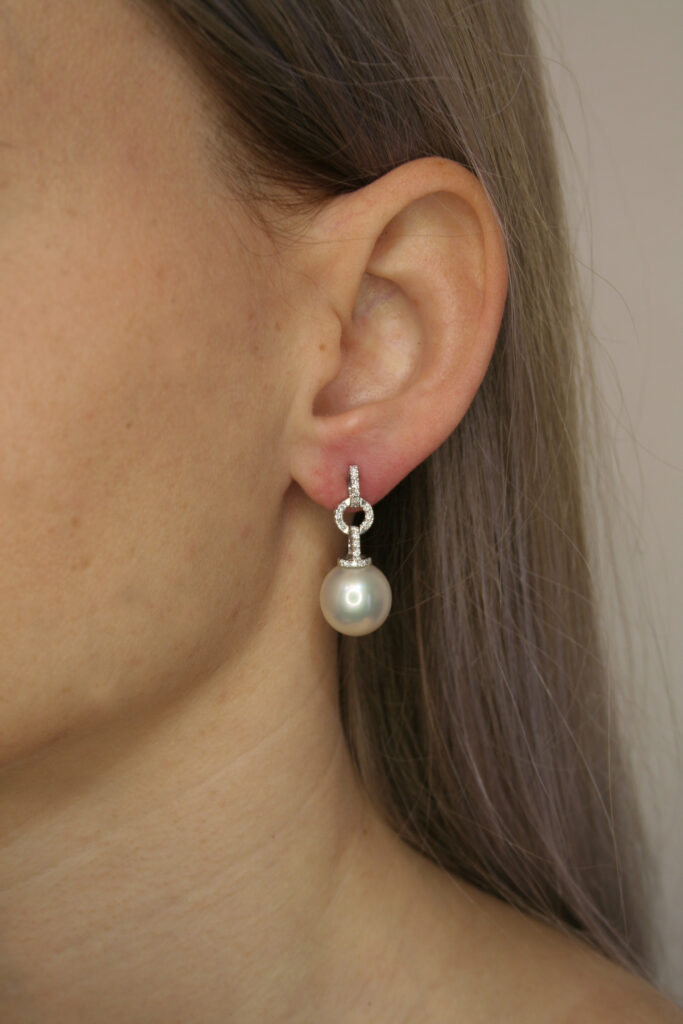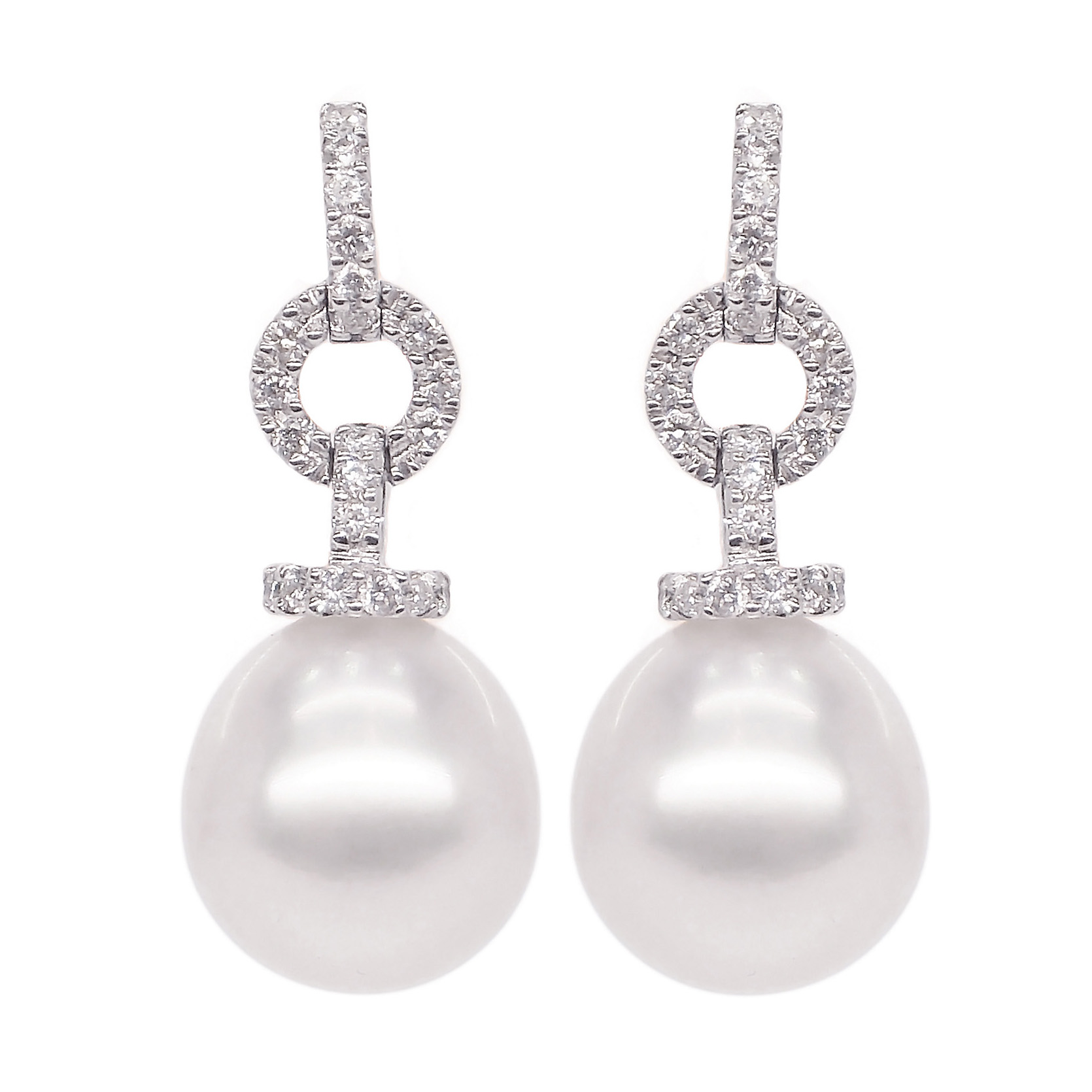 A glamorous pair of earrings with sparkling brilliant cut diamonds and lustrous South Sea pearls set in 18K white gold.