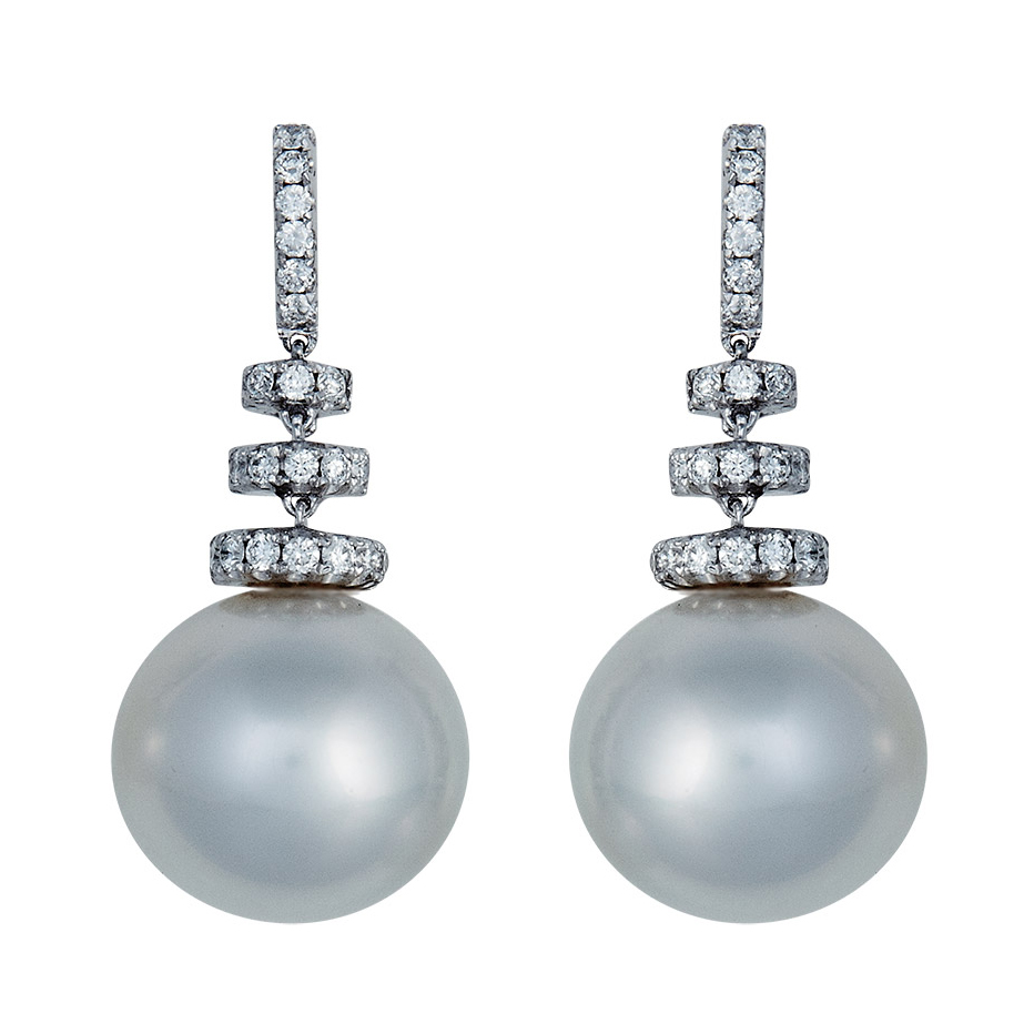 A classic pair of earrings. The perfect combination of glowing brilliant cut diamonds and flawless South Sea pearls set in 18K white gold.