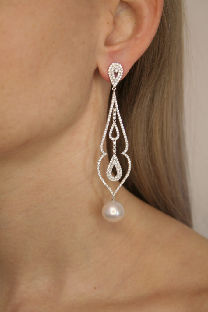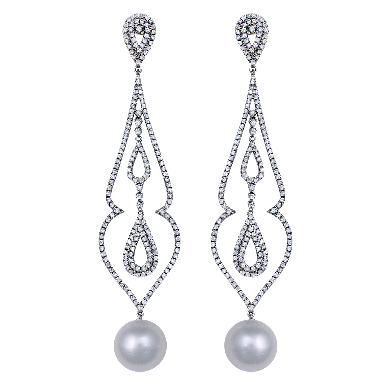A vintage design pair of earrings set in 18K white gold with bright brilliant cut diamonds and glossy South Sea pearls.
