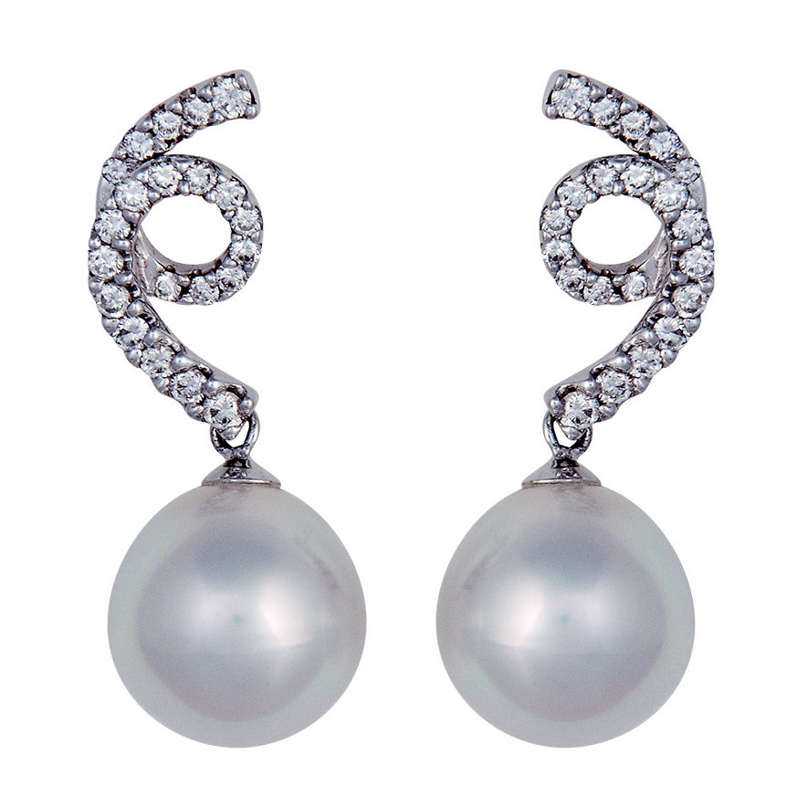 Luxurious and elegant earrings with sparkling brilliant cut diamonds and glossy South Sea pearls set in 18K white gold.