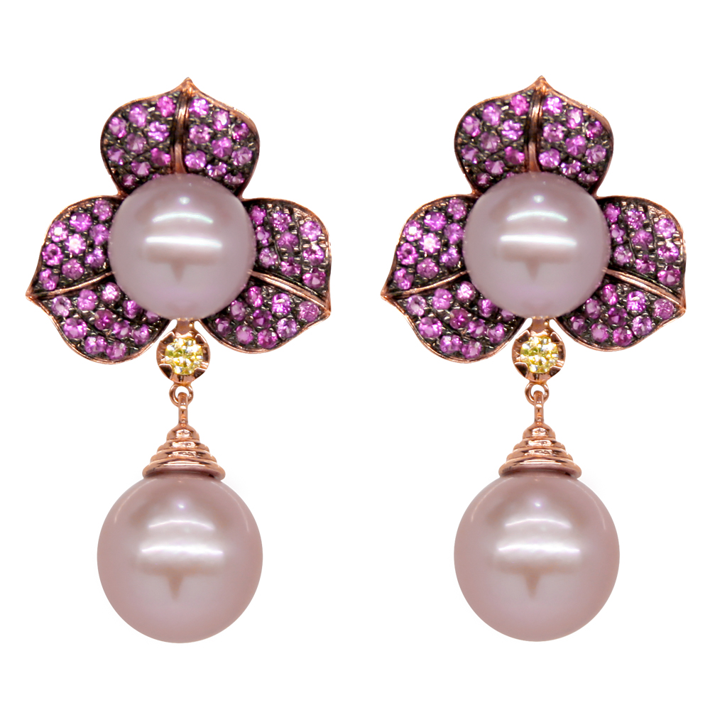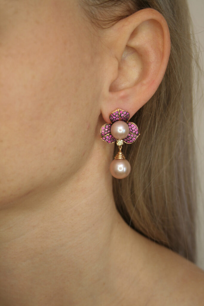 Spectacular floral earrings inspired by nature! Edison pearls in natural pink tones and brilliant cut magenta sapphires set in 18K rose gold.