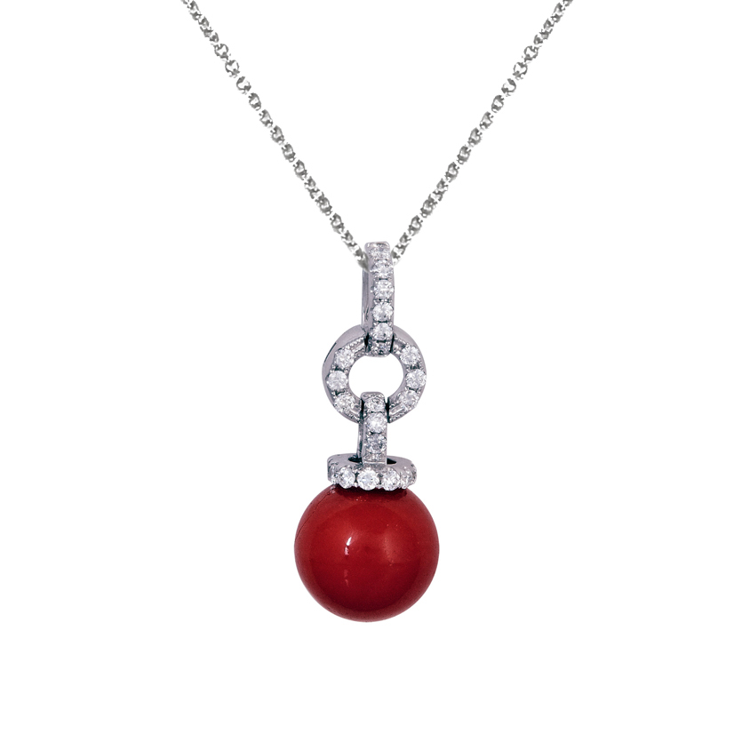 An elegant and timeless pendant with sparkling brilliant cut diamonds and a flawless coral stone set on a 14K white gold chain. Bold and beautiful.