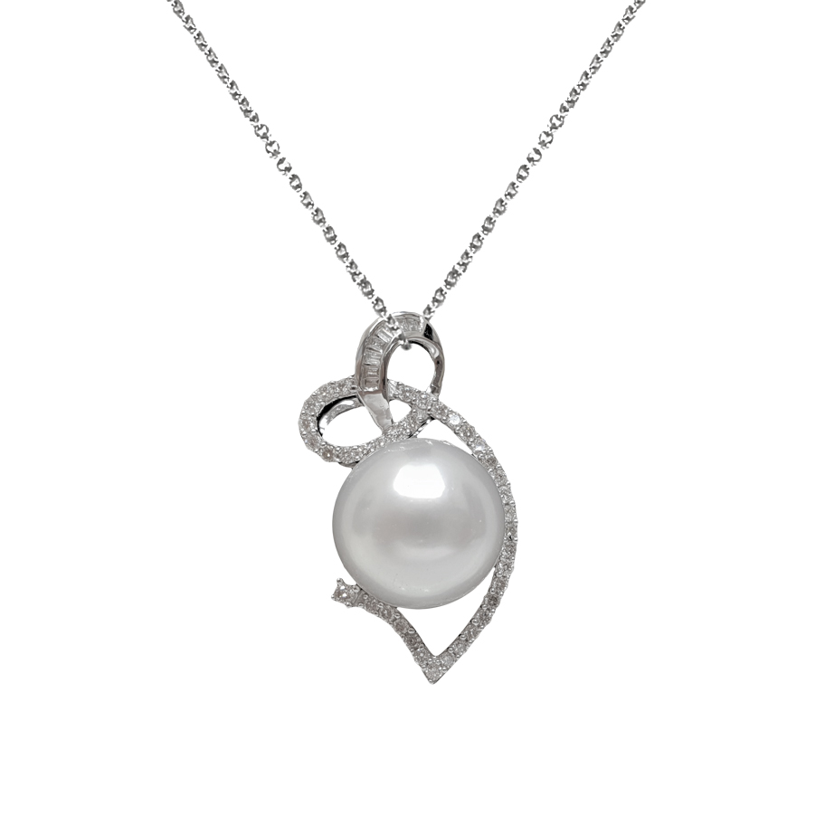 A retro design pendant combined with glamorous baguette and brilliant cut diamonds and a lustrous South Sea pearl set in 18K white gold.
