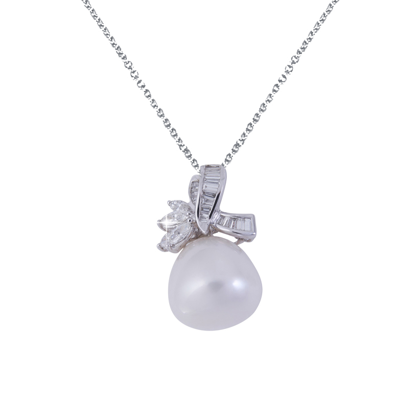 A retro design pendant combined with glamorous baguette and brilliant cut diamonds and a lustrous South Sea pearl set on a 14K white gold chain.
