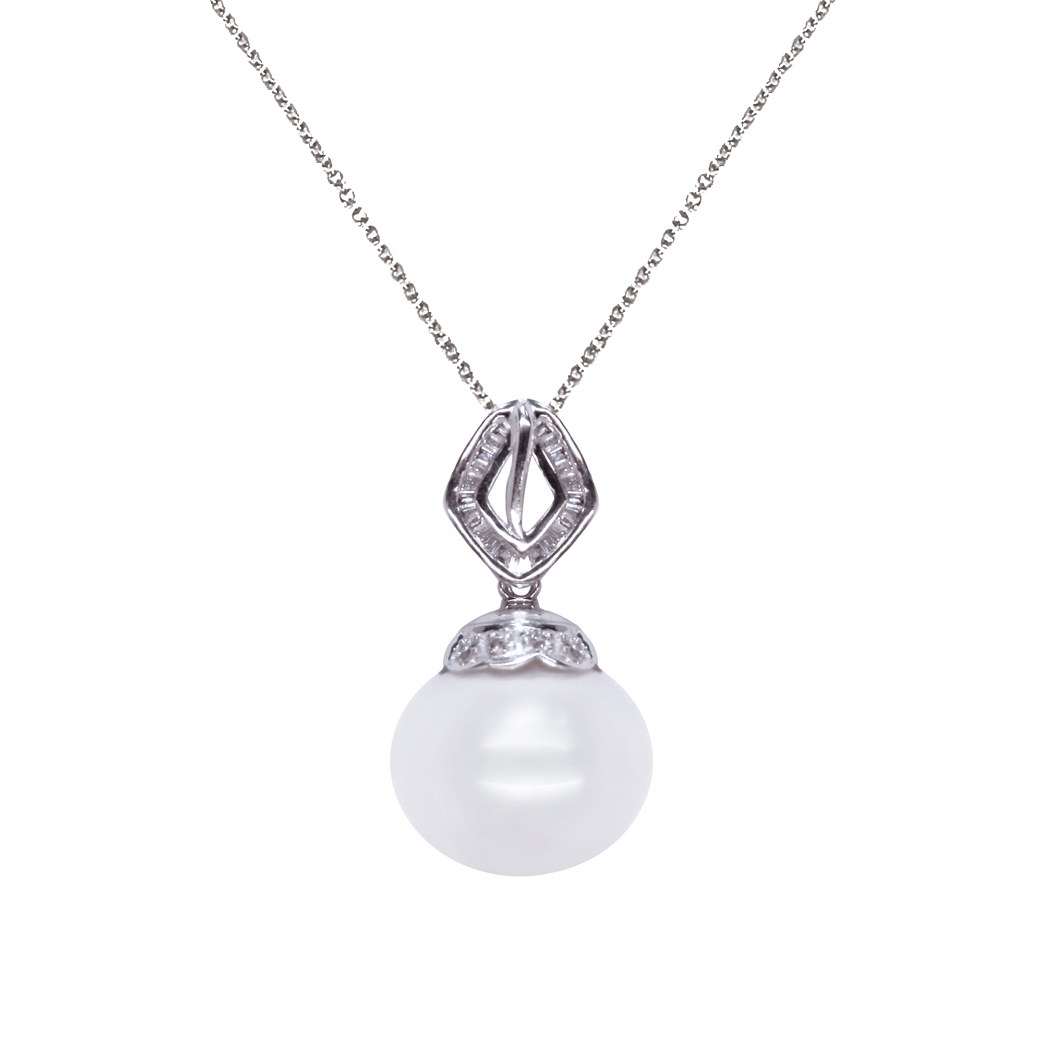 An exquisite pendant with glamorous brilliant and baguette cut diamonds and a silky South Sea pearl set on a 14K white gold chain.
