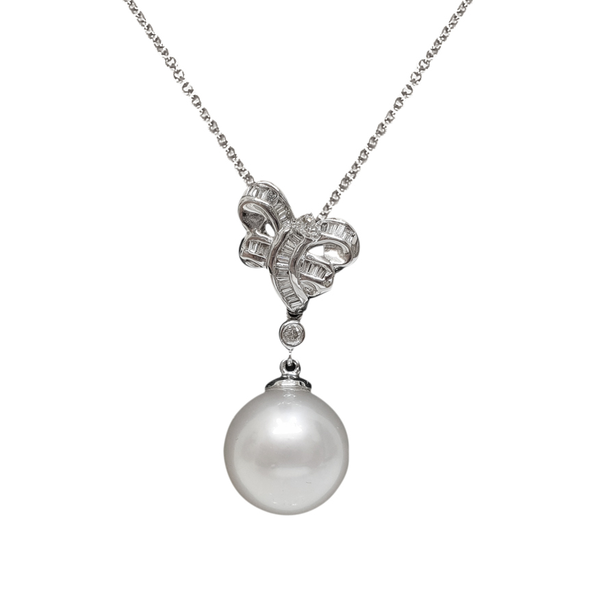 An exquisite pendant with a perfect combination of glamorous brilliant and baguette cut diamonds and a lustrous South Sea pearl set in 18K white gold.