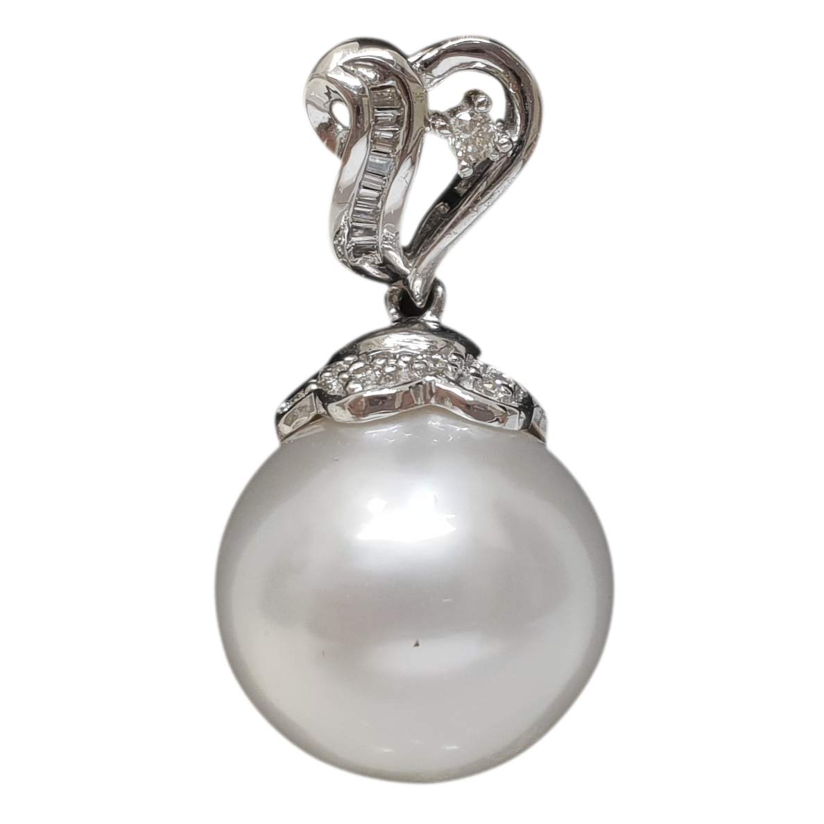 A retro design pendant combined with glamorous baguette and brilliant cut diamonds and a lustrous South Sea pearl set in 14K white gold.