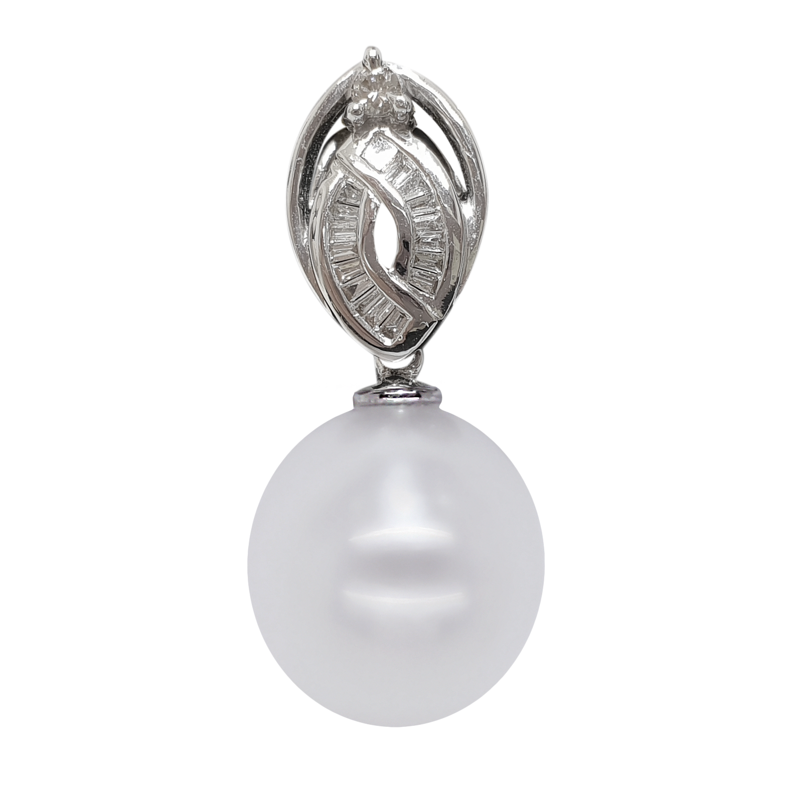 A retro design pendant combined with glamorous baguette and brilliant cut diamonds and a lustrous South Sea pearl set in 14K white gold.