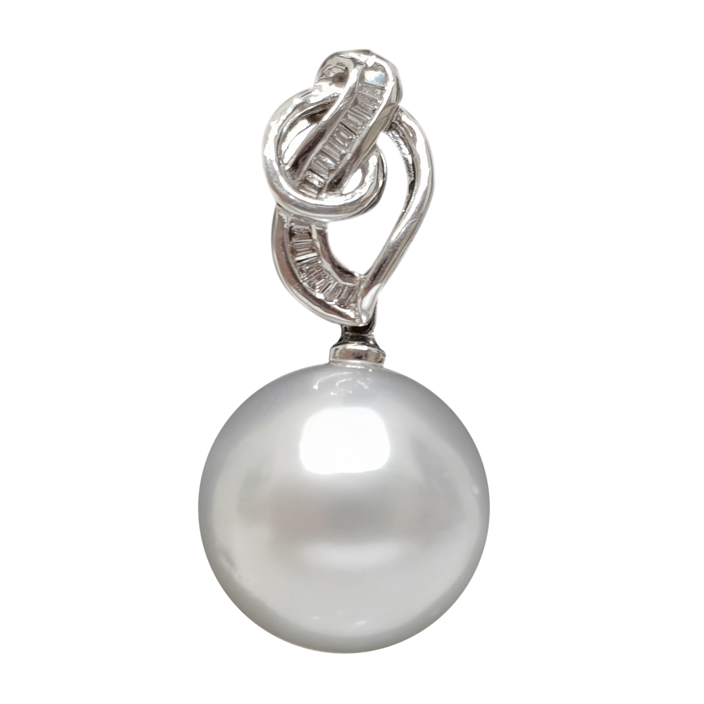 An elegant pendant with a South Sea pearl and  sparkling baguette cut diamonds, set in 18K white gold.