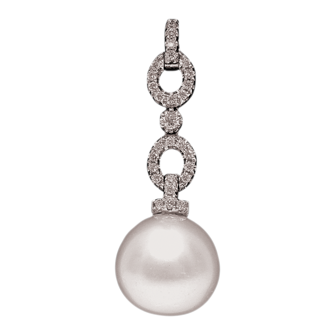 A minimal and elegant pendant with a flawless South Sea pearl and brilliant cut diamonds set in 18K white gold. Achieve a perfect balance between elegance and romanticism with this beautiful piece of jewelry.