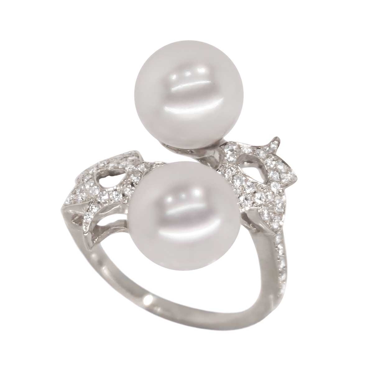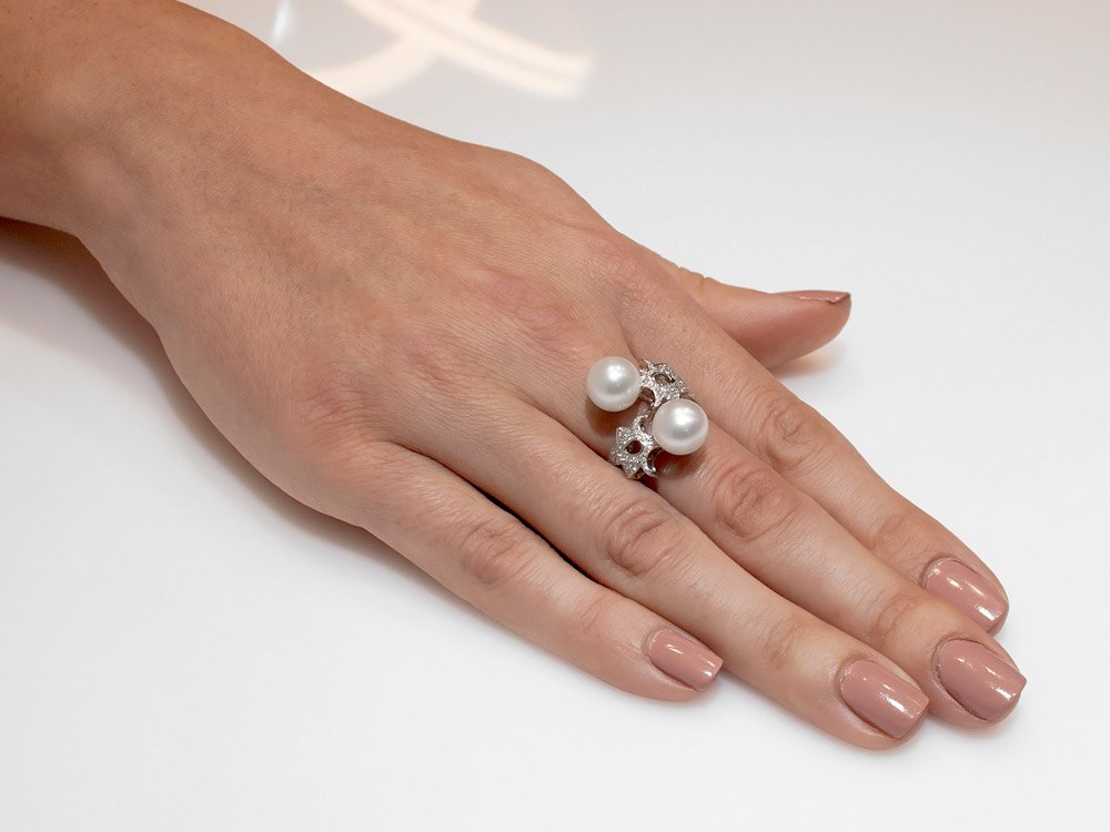 A magnificent Byzantine design ring with a modern twist. Sparkling brilliant cut diamonds in perfect combination with a lustrous Akoya pearl set in 18K white gold.