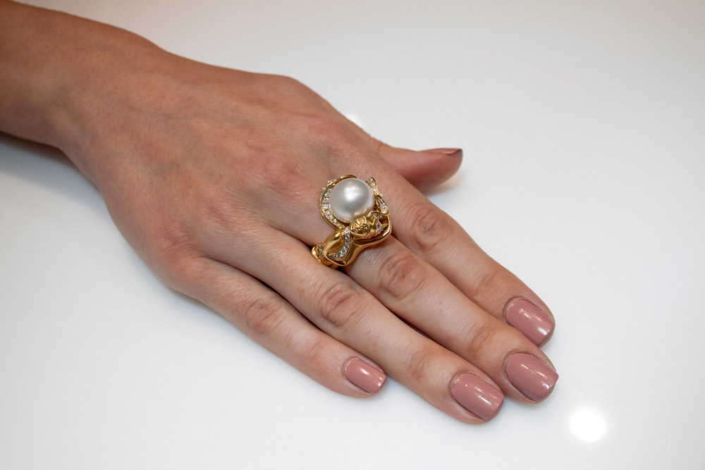 A fairytale mermaid ring design with sparkling brilliant cut diamonds and a flawless South Sea pearl set in 18K yellow gold.