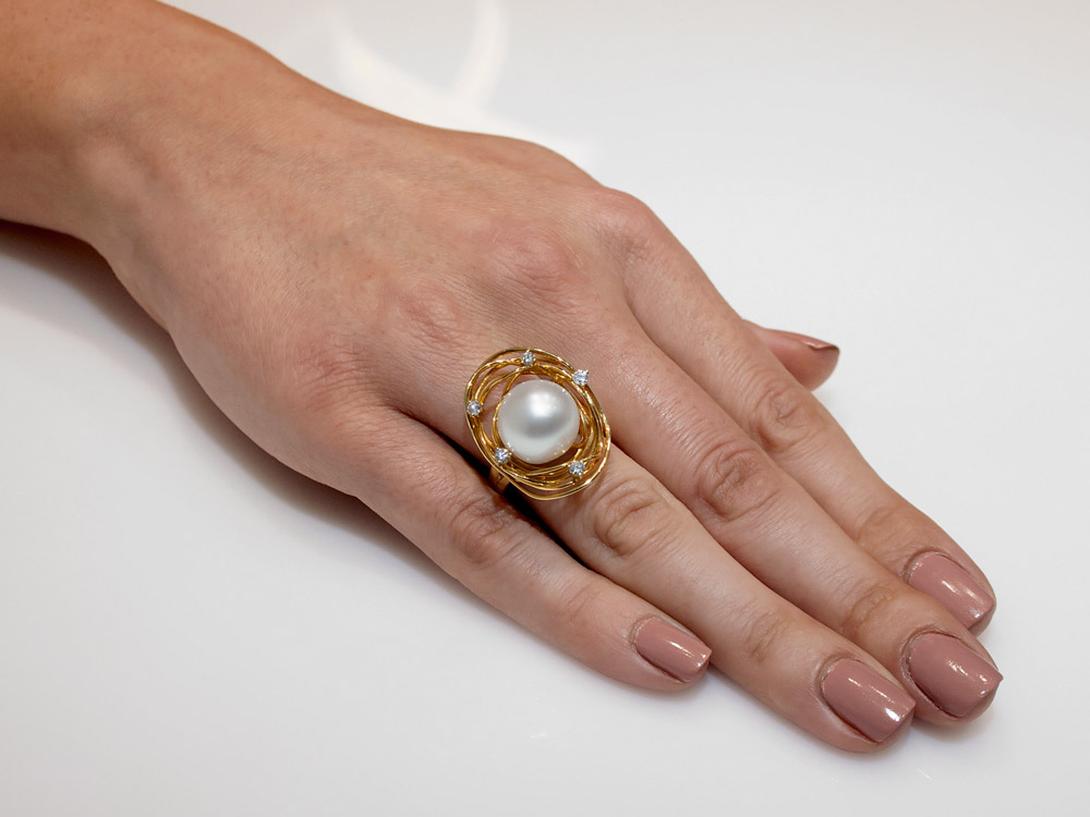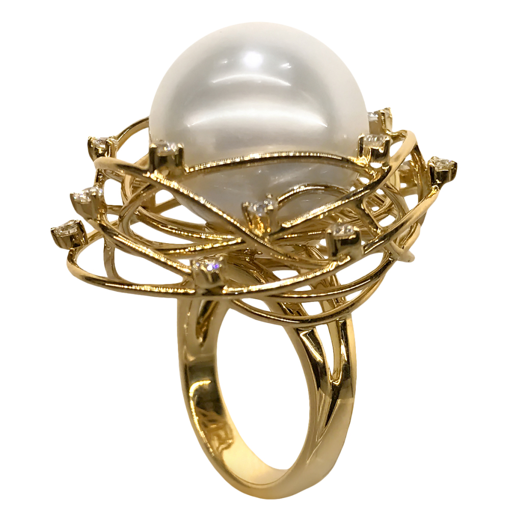 A spectacular ring with radiant brilliant cut diamonds and a lustrous South Sea pearl set in an intricate 18K yellow gold nest.