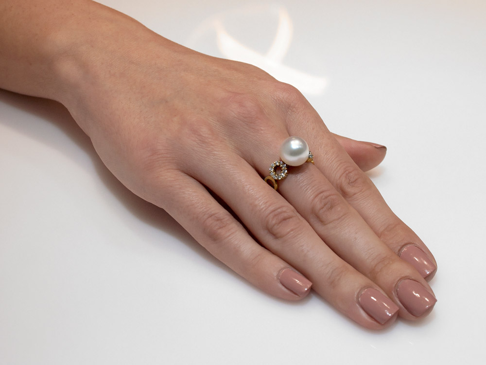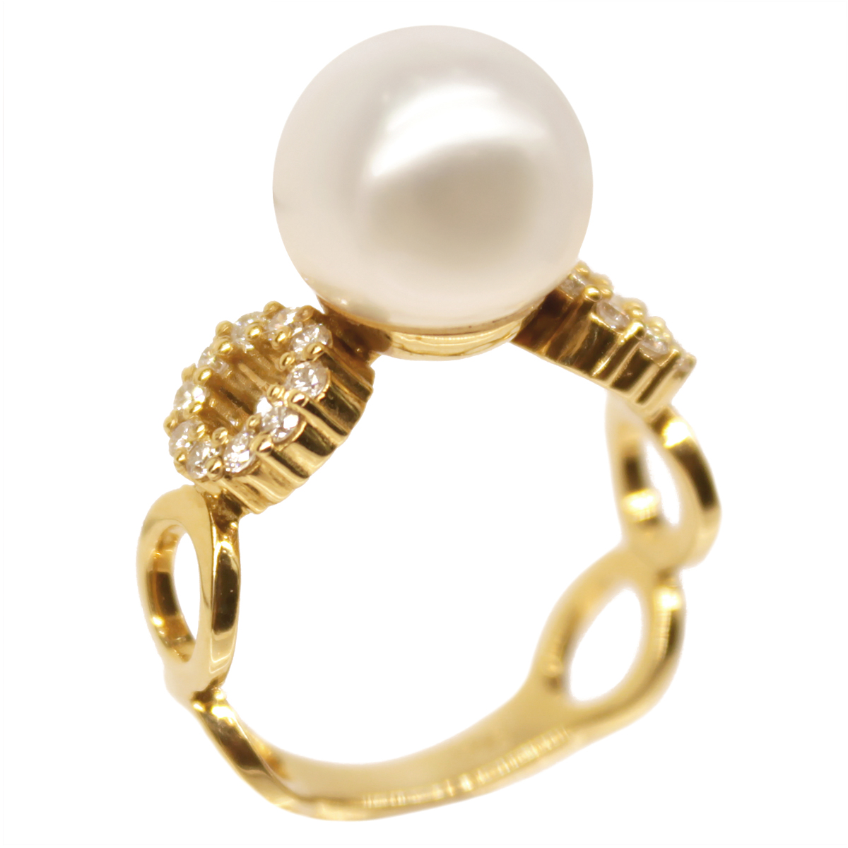 An elegant ring with charming brilliant cut diamonds and a glossy South Sea earl set in 18K yellow gold.