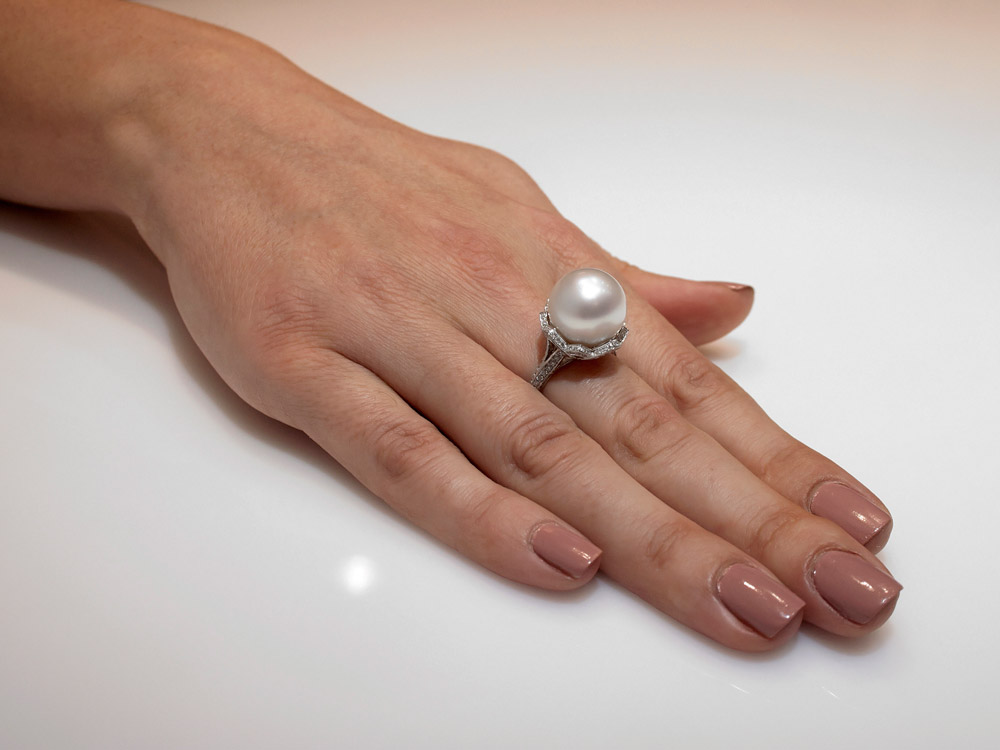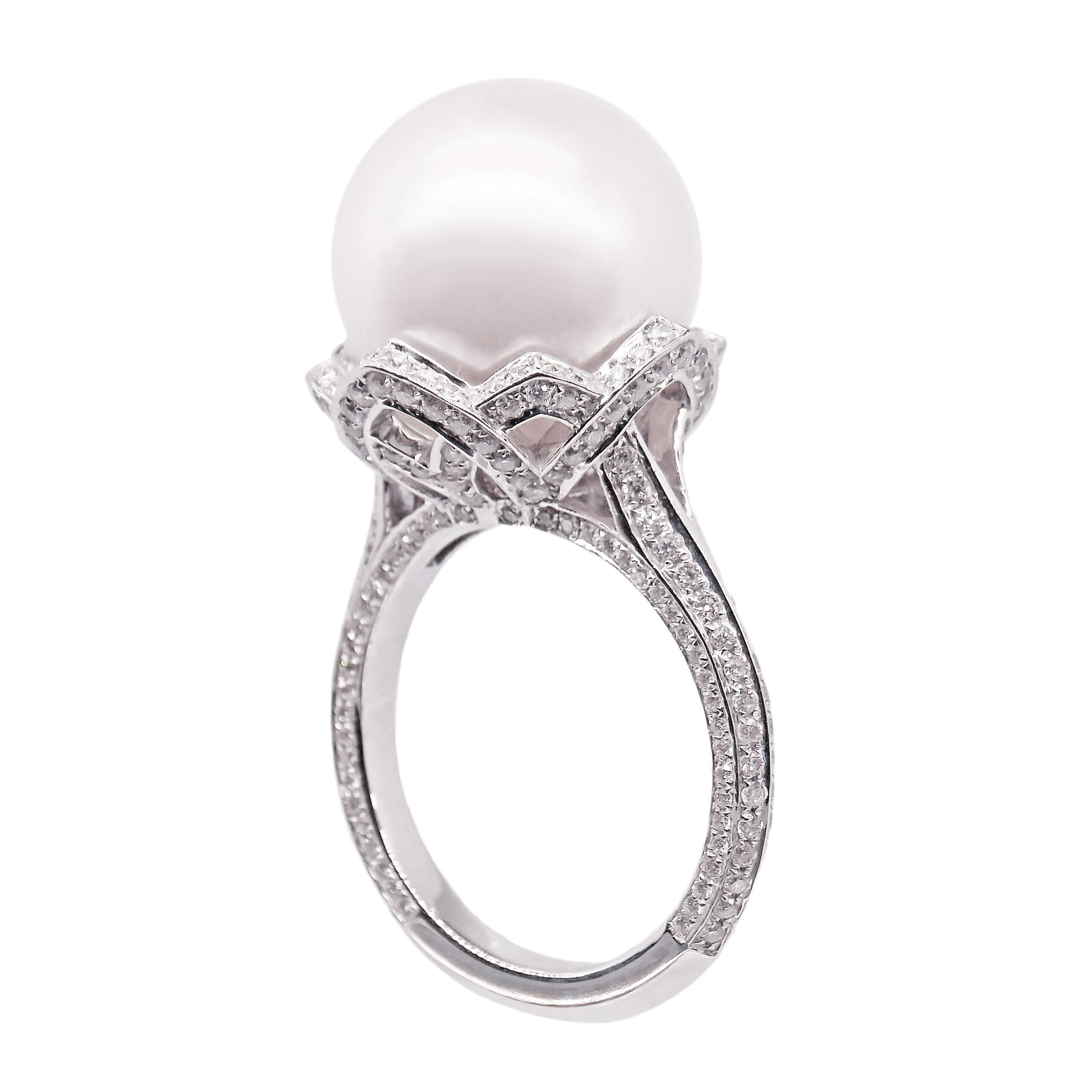 A Byzantine inspired design ring with sparkling brilliant cut diamonds combined perfectly with a sleek South Sea pearl and set in 18K white gold.