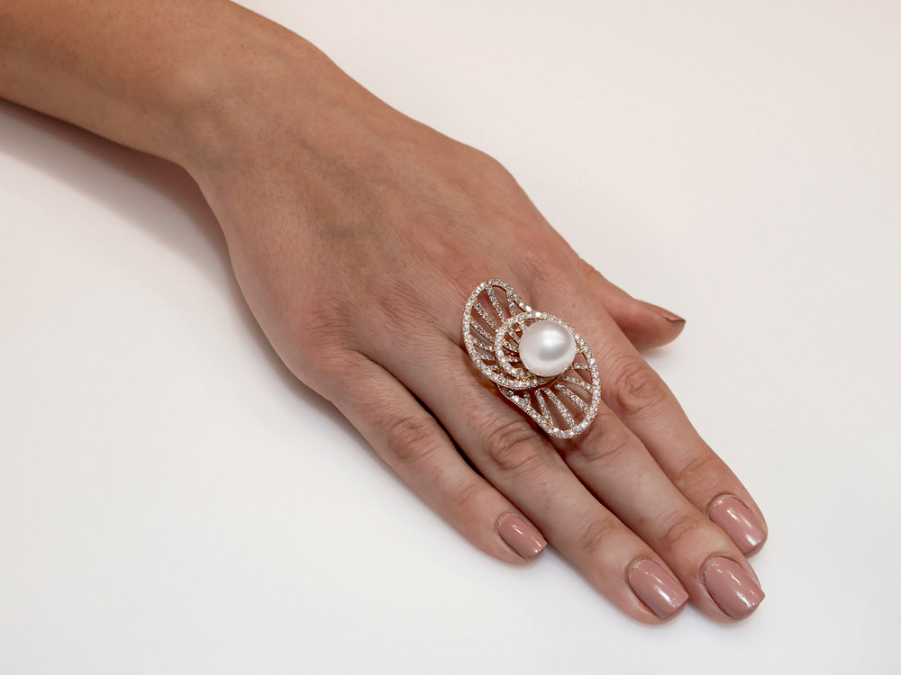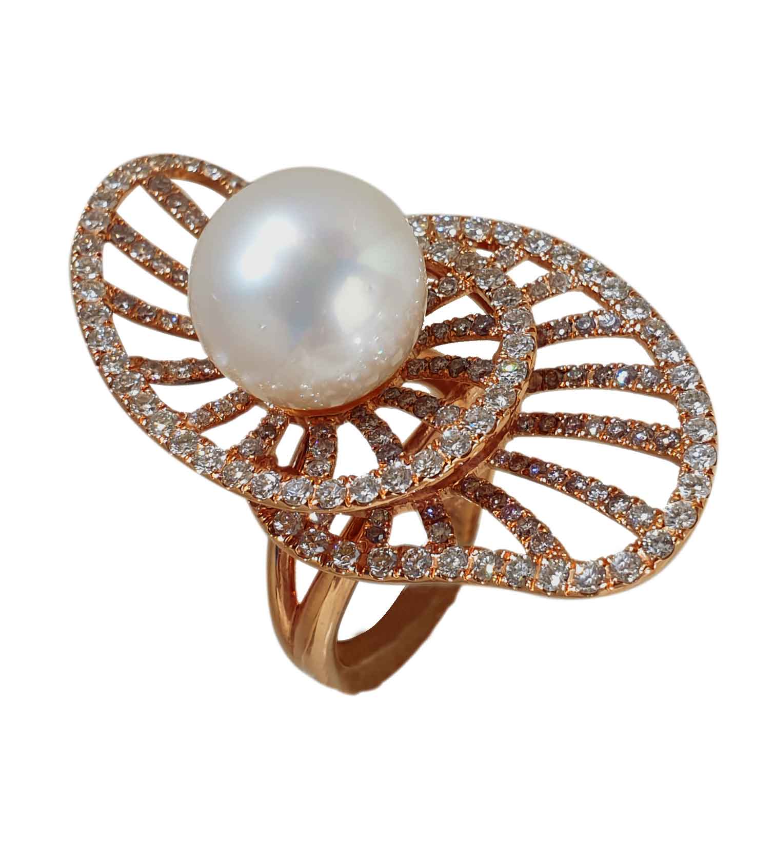 A vintage style 18K rose gold ring with charming white and brown brilliant cut diamonds and a gorgeous South Sea pearl.