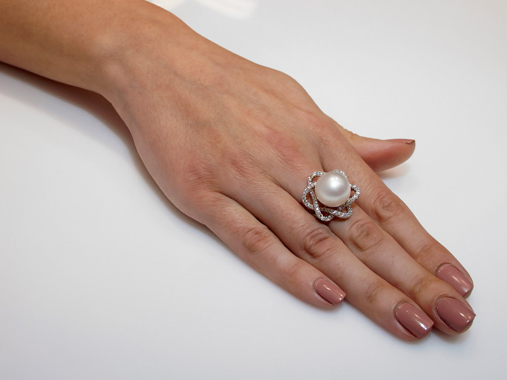 A spectacular ring with a glossy South Sea pearl and sparkling brilliant cut diamonds set perfectly in 18K white gold. Minimal and fashionable.