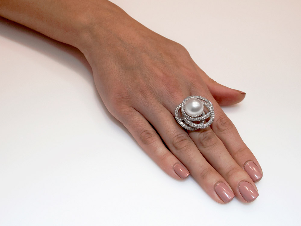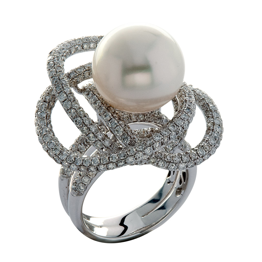 A spectacular ring with a flawless South Sea pearl and sparkling brilliant cut diamonds set in 18K white gold. Dazzling and delightful.