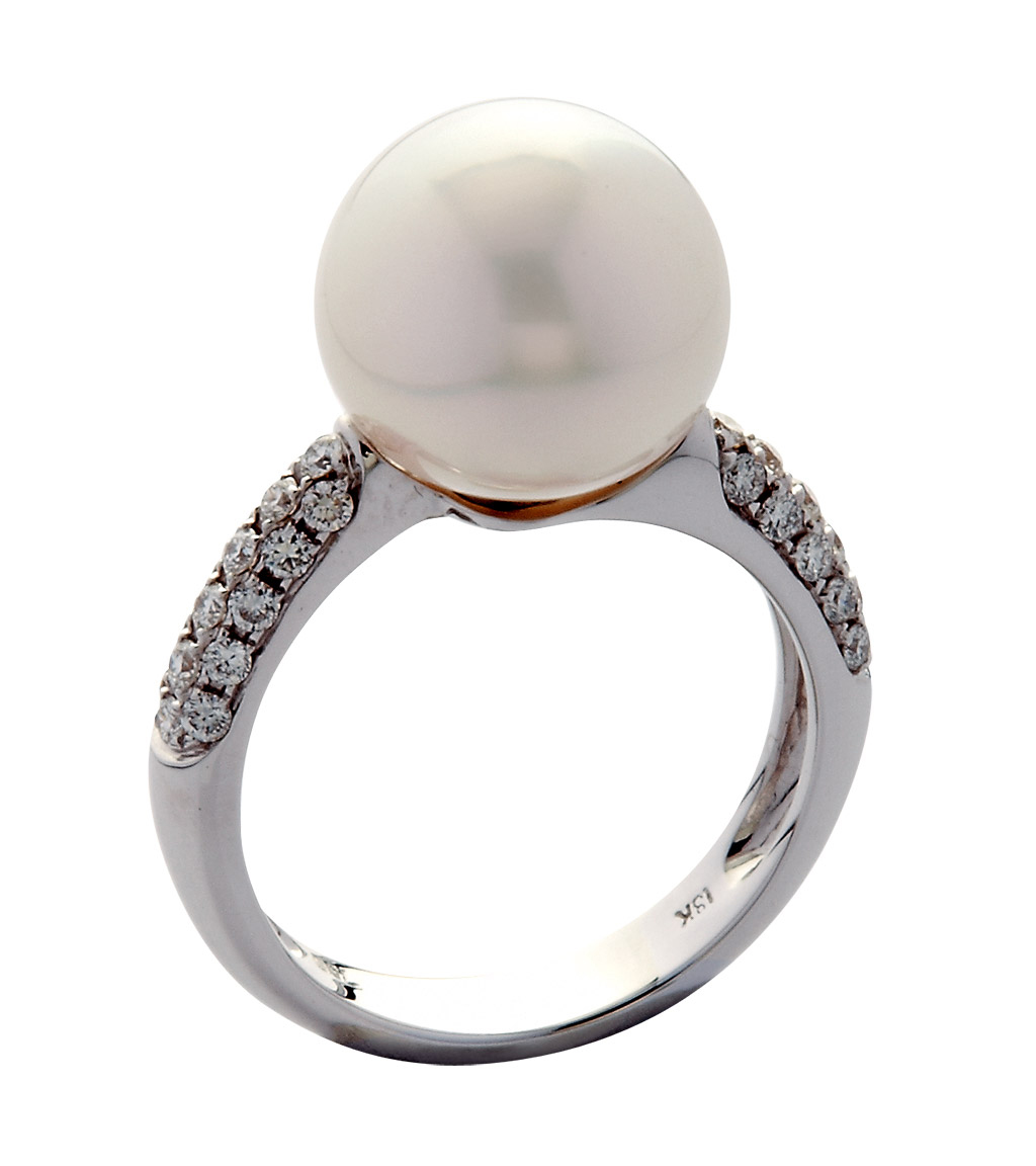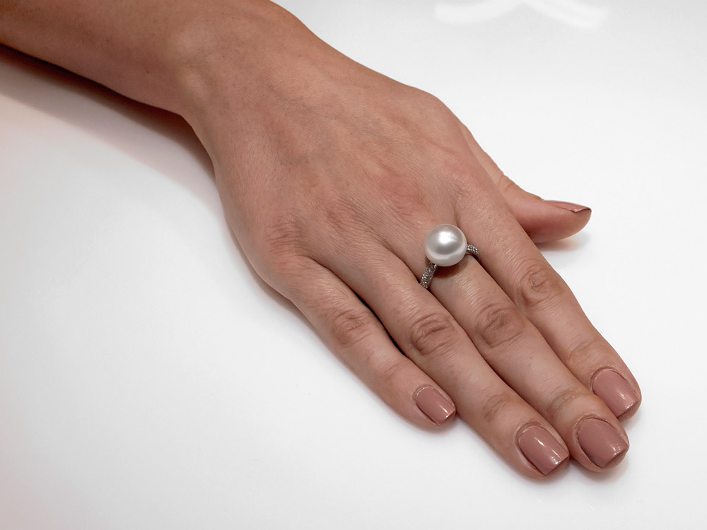 A luxurious ring with a glossy South Sea pearl and sparkling brilliant cut diamonds set perfectly in 18K white gold. Minimal and chic.