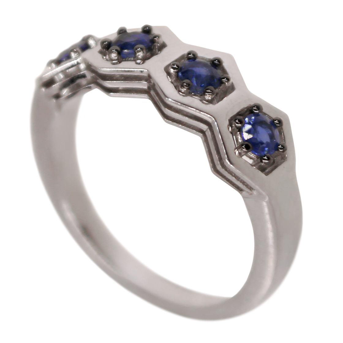 A modern geometric ring adorned with charming brilliant cut sapphires and set in 18K white gold.