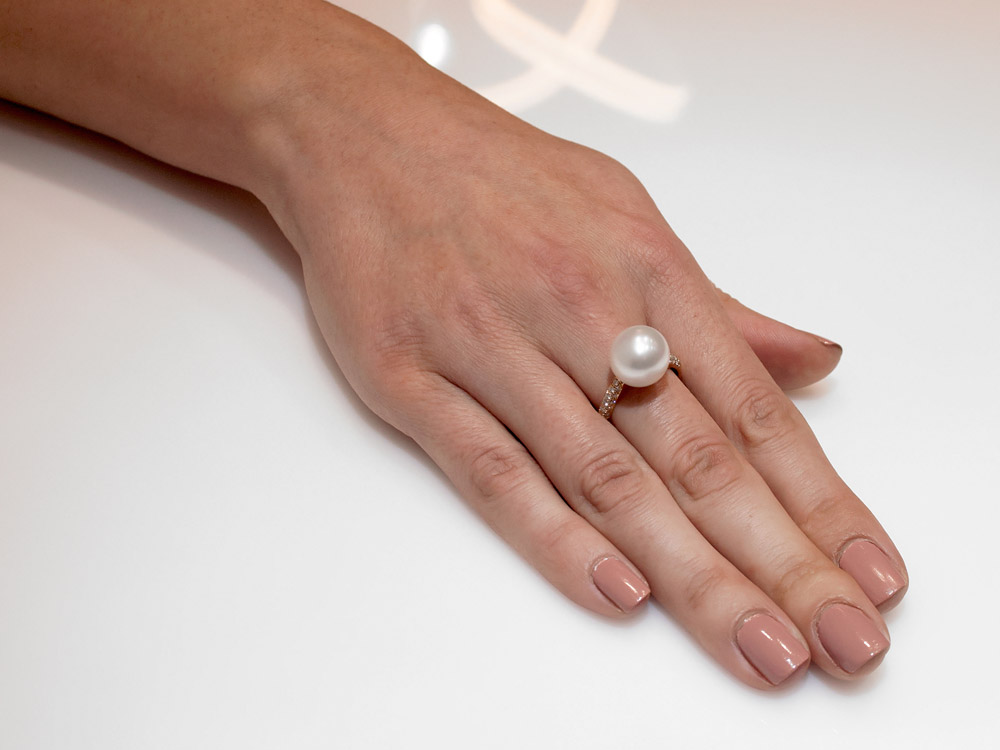 A luxurious ring with a glossy South Sea pearl and sparkling brilliant cut diamonds set perfectly in 18K rose gold. Minimal and chic.