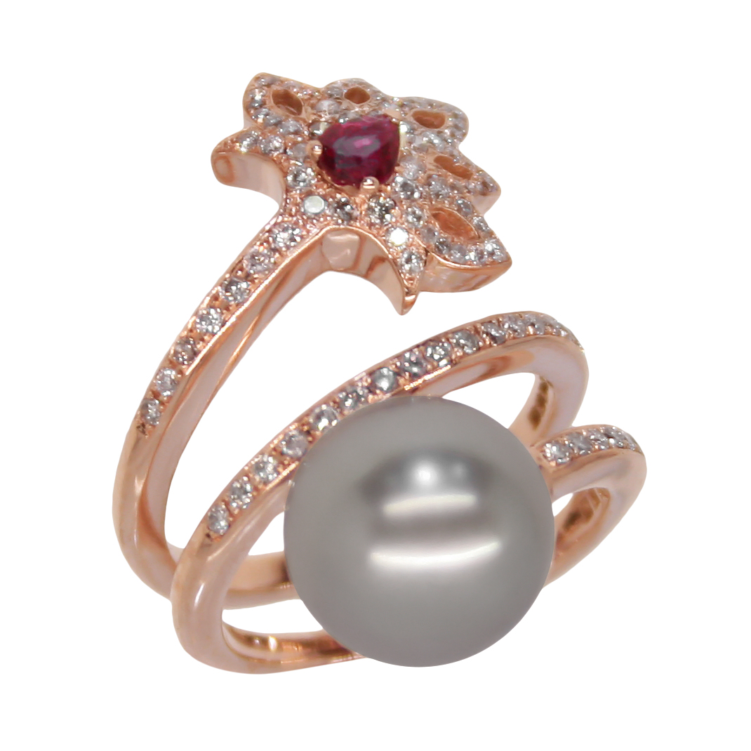 A Byzantine inspired design ring with charming brilliant cut diamonds combined perfectly with sensational rubies and a black Tahitian pearl set in 18K rose gold.