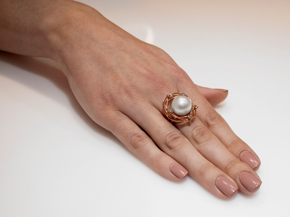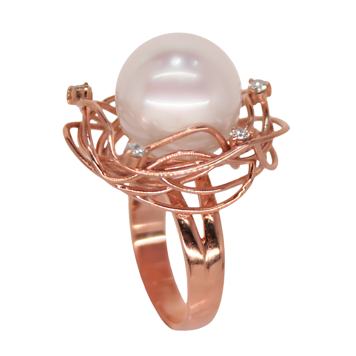 A gorgeous ring set in an 18K rose gold nest with radiant brilliant cut diamonds and a lustrous South Sea pearl.