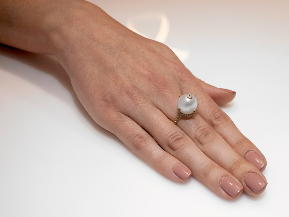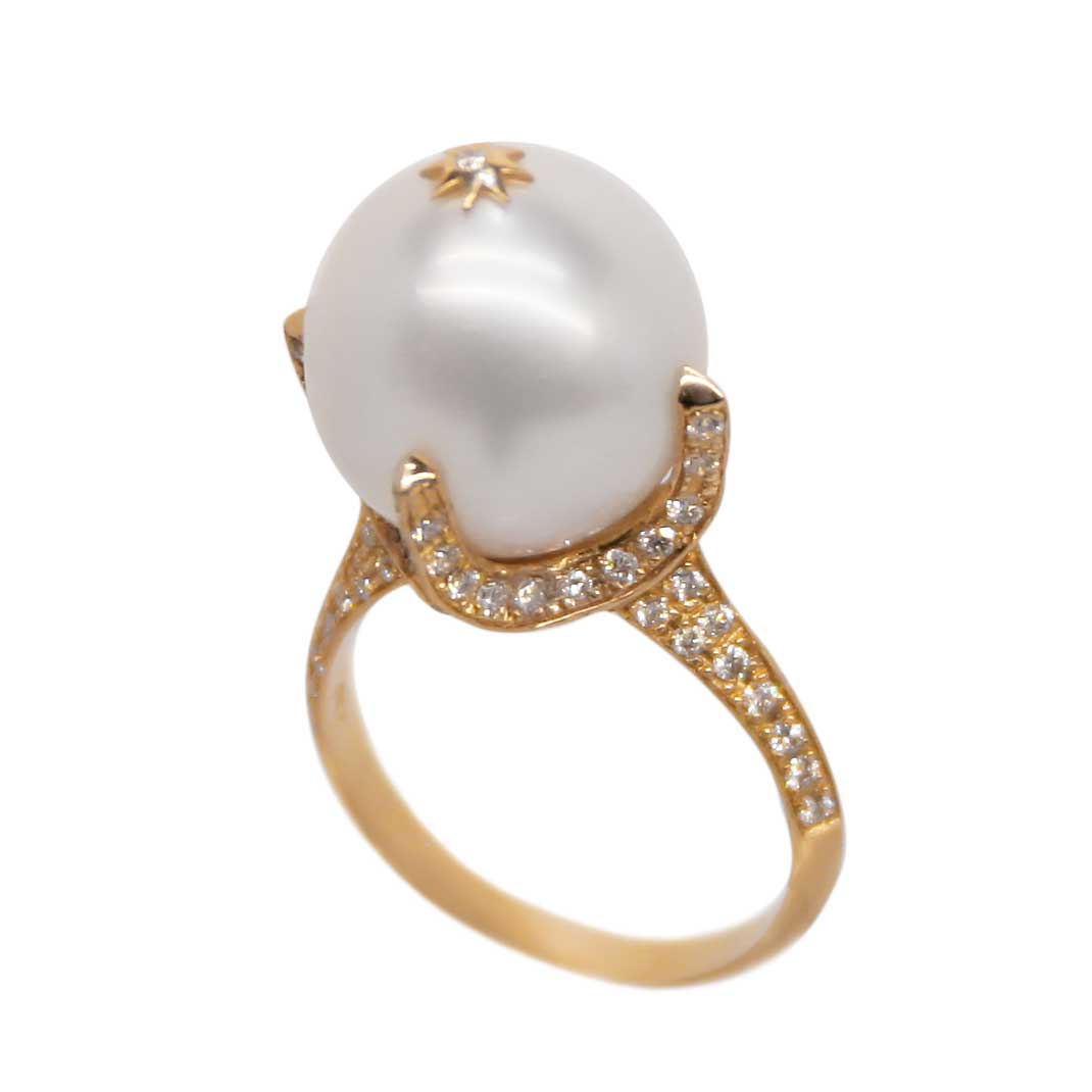 A glamorous modern ring with a flawless South Sea pearl and sparkling brilliant cut diamonds set in 18K yellow gold.