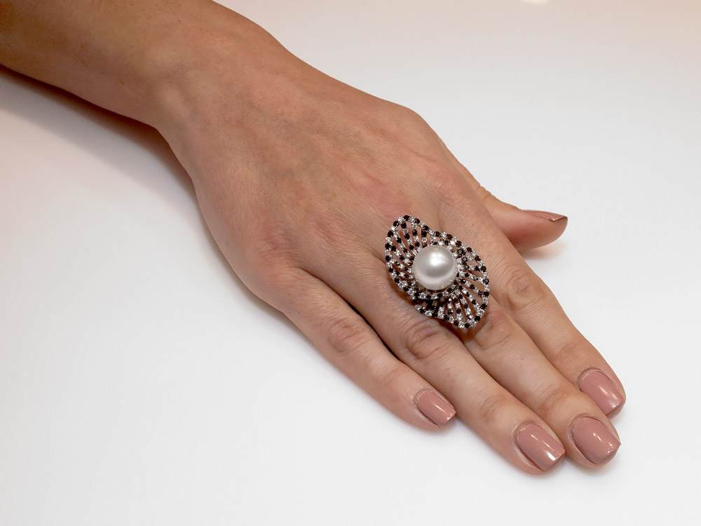 A mesmerizing flower design ring with black and white brilliant cut diamonds combined perfectly with a lovely South Sea pearl, set in 18K white gold.