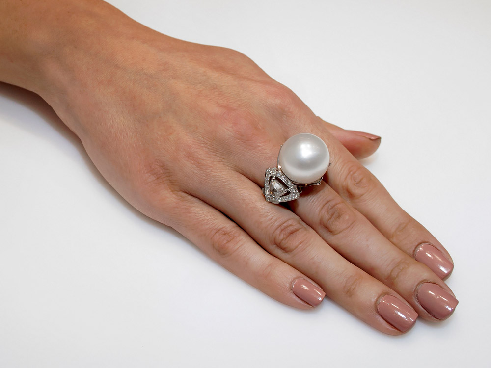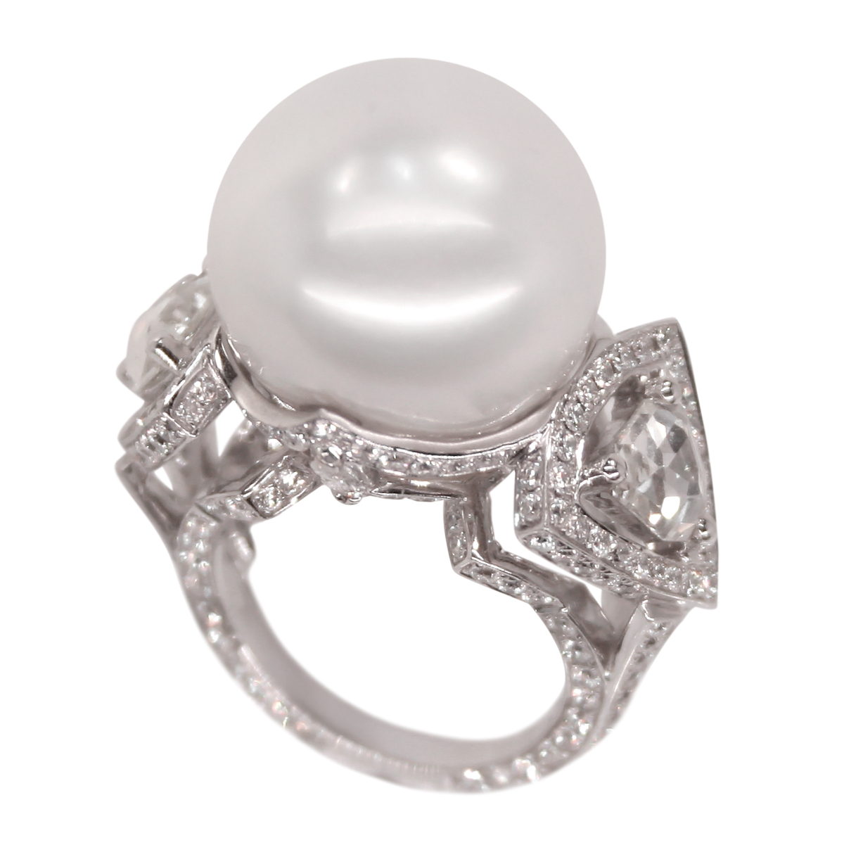 Bold and luxurious triangle ring set in 18K white gold perfectly combined with glamorous brilliant cut diamonds and crowned with a shimmering South Sea pearl.