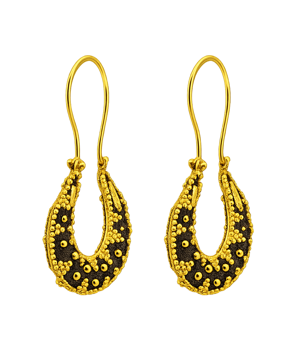 Ανακαλύψτε τη μαγεία της παράδοσης με μια μοντέρνα πινελιά. Αυτό το ζευγάρι κρεμαστά σκουλαρίκια συνδυάζει τη λαμπρότητα της βυζαντινής κοσμηματοποιίας με την παραδοσιακή Μπούκλα Καστελλορίζου. Φτιαγμένα από ζεστό κίτρινο χρυσό με μαύρο πλατίνωμα, αναδεικνύουν μοναδικά τα ανάγλυφα μοτίβα, προσφέροντας βάθος, αντίθεση και χειροποίητη τελειότητα σε κάθε λεπτομέρεια. Ένα κόσμημα που παντρεύει ιστορία, τέχνη και σύγχρονη κομψότητα, ιδανικό για εμφανίσεις που θέλουν να μαγνητίζουν τα βλέμματα.