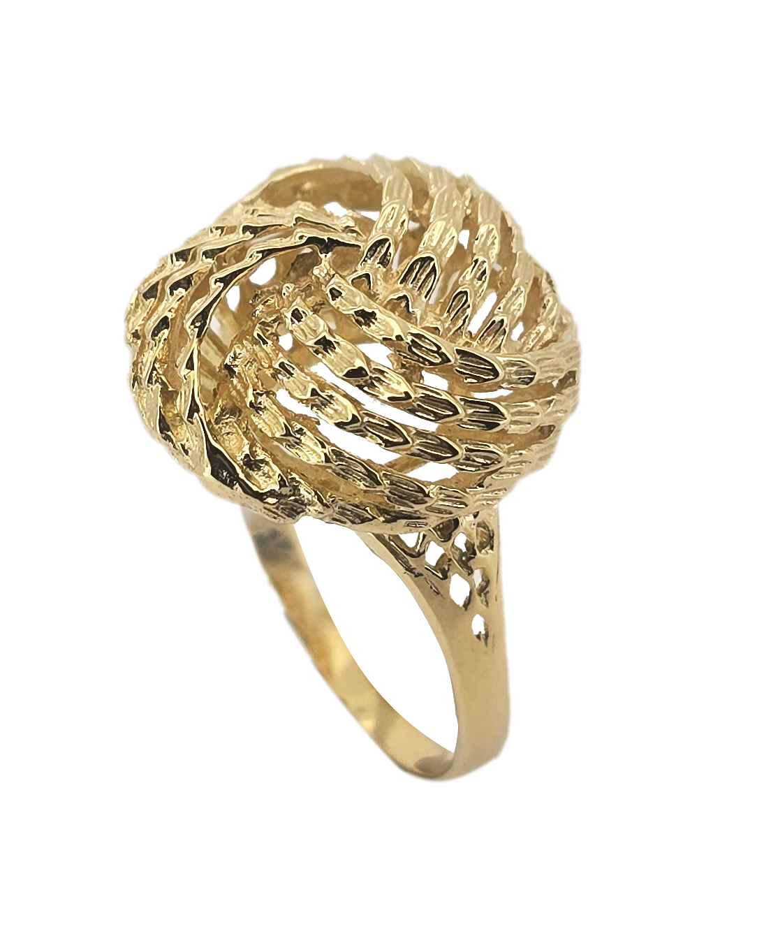 Ένα εκλεπτυσμένο δαχτυλίδι από κίτρινο χρυσό με περίτεχνη πλέξη, εμπνευσμένο από vintage αισθητική. Οι λεπτομέρειες του σχεδίου αναδεικνύουν τη διαχρονική του κομψότητα, ενώ η ζεστή απόχρωση του χρυσού προσδίδει αίσθηση πολυτέλειας και ρομαντισμού. Ένα μοναδικό κόσμημα που παντρεύει το παρελθόν με το σύγχρονο στυλ, ιδανικό για ξεχωριστές εμφανίσεις.
