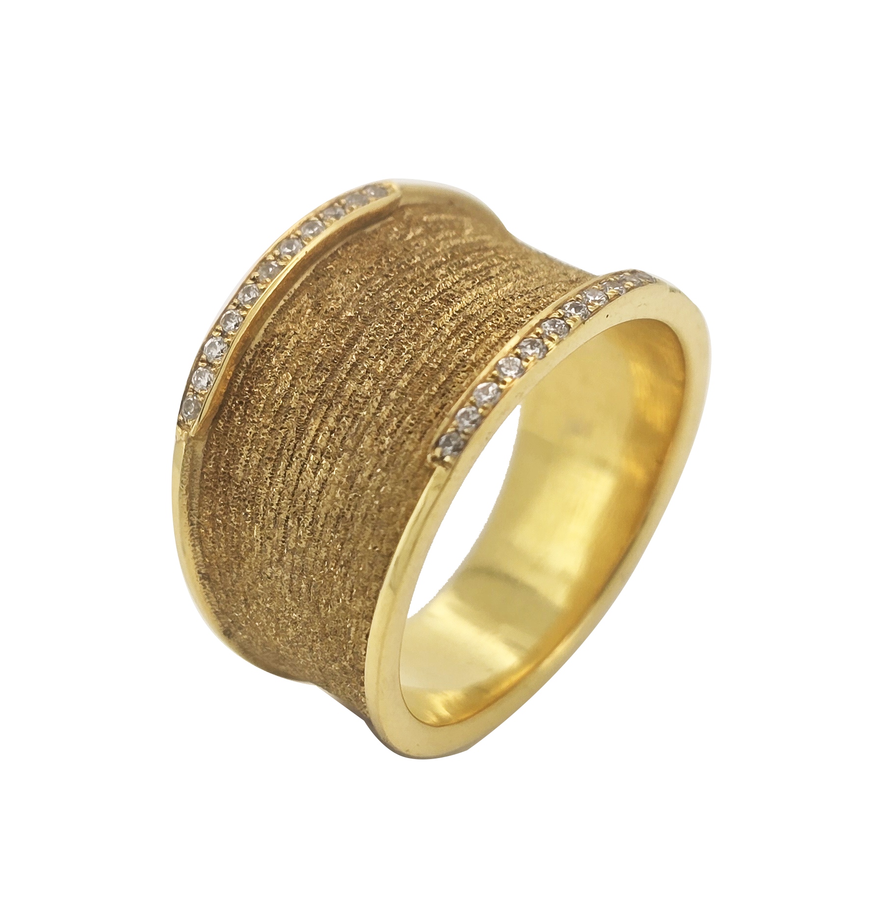 Ανακαλύψτε τη διακριτική πολυτέλεια μέσα από αυτό το χειροποίητο δαχτυλίδι από κίτρινο frosted χρυσό, που ξεχωρίζει για την ιδιαίτερη ματ υφή του και τη σύγχρονη αισθητική του. Τα λεπτεπίλεπτα λευκά διαμάντια προσθέτουν μια απαλή, εκλεπτυσμένη λάμψη, αναδεικνύοντας το σχέδιο χωρίς υπερβολές. Ένα μοναδικό κόσμημα που συνδυάζει την αυθεντικότητα της χειροποίητης δημιουργίας με τη διαχρονική κομψότητα, ιδανικό για όσους εκτιμούν το understated στυλ.