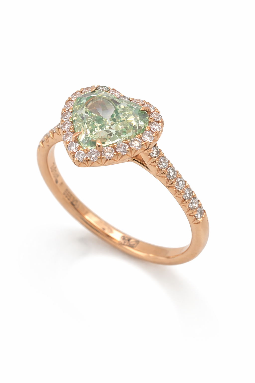 Ρομαντικό και εκθαμβωτικό μονόπετρο δαχτυλίδι σε ροζ χρυσό, με κεντρικό πράσινο διαμάντι σε σχήμα καρδιάς που αιχμαλωτίζει το φως και μαγνητίζει τα βλέμματα. Ο ζεστός τόνος του ροζ χρυσού αναδεικνύει τη μοναδική απόχρωση του πράσινου διαμαντιού, δημιουργώντας ένα κόσμημα γεμάτο θηλυκότητα, ρομαντισμό και εκλεπτυσμένη λάμψη, ιδανικό για να εκφράσει αγάπη και ξεχωριστές στιγμές.