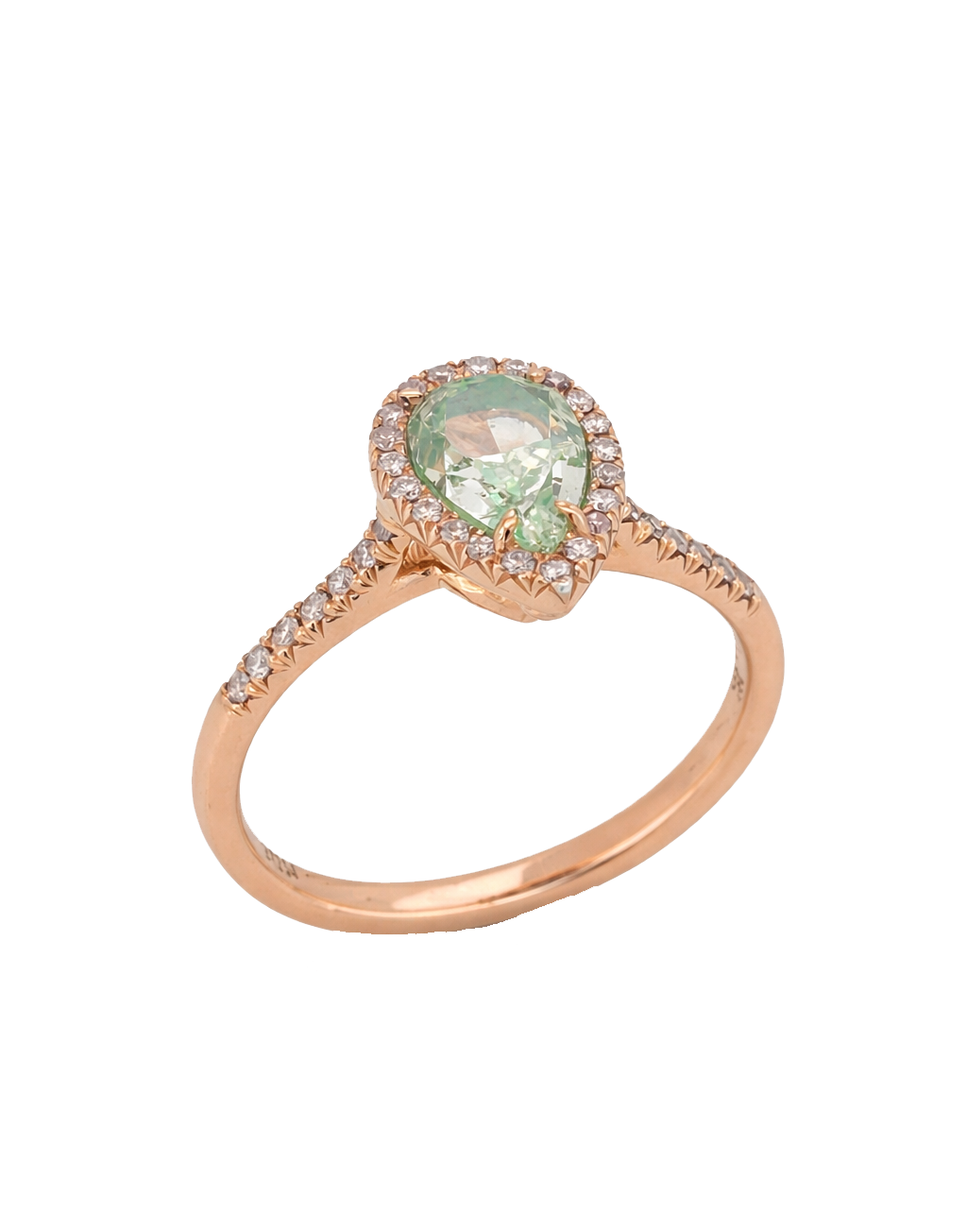 Εντυπωσιακό δαχτυλίδι σε ροζ χρυσό με κεντρικό πράσινο διαμάντι σε pear cut, που αιχμαλωτίζει το φως με κάθε κίνηση. Η απαλή απόχρωση του ροζ χρυσού αναδεικνύει τη ζωντάνια και τη σπάνια ομορφιά του πράσινου διαμαντιού, δημιουργώντας ένα κόσμημα γεμάτο θηλυκότητα, εκλεπτυσμένη λάμψη και ρομαντική φινέτσα, ιδανικό για μοναδικές στιγμές.