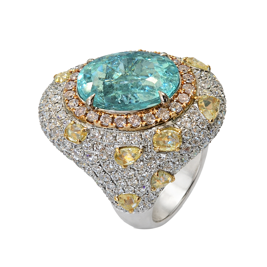 Εντυπωσιακό δαχτυλίδι με το σπάνιο και μαγευτικό πετράδι Paraíba τουρμαλίνη στο κέντρο, που ξεχωρίζει με τη ζωντανή μπλε-πράσινη απόχρωση του. Περιβάλλεται από λαμπερά κίτρινα διαμάντια που προσθέτουν ζεστασιά και έντονη λάμψη, δημιουργώντας μια μοναδική αντίθεση χρωμάτων και φινέτσας. Ένα κομψό και εκλεπτυσμένο κόσμημα που αιχμαλωτίζει το βλέμμα και αναδεικνύει την ξεχωριστή προσωπικότητα του ιδιοκτήτη του.