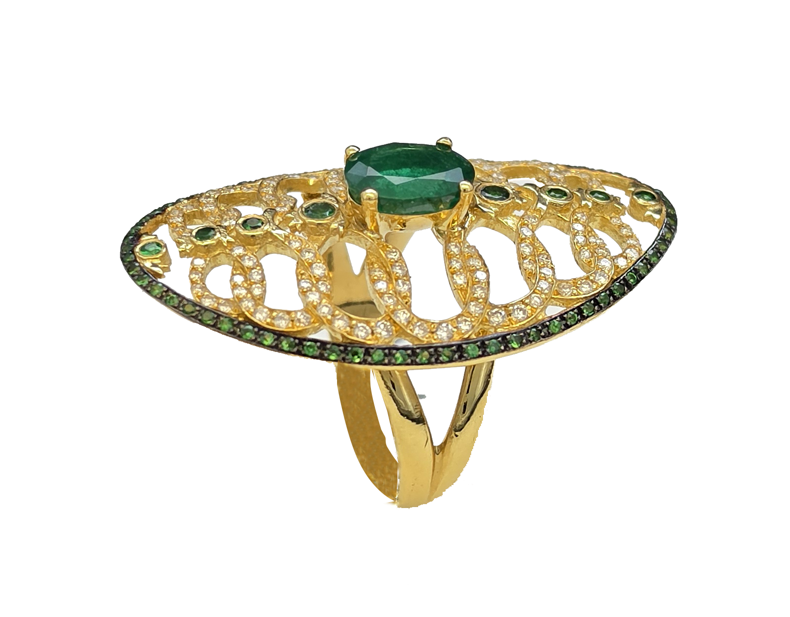 Εντυπωσιακό δαχτυλίδι από κίτρινο χρυσό σε οβάλ σχήμα, με ιδιαίτερη πλέξη που αναδεικνύει την καλλιτεχνική του λεπτομέρεια. Η σύνθεση κοσμείται από λαμπερά λευκά διαμάντια και ζωντανούς τσαβορίτες, δημιουργώντας μια εκλεπτυσμένη αντίθεση χρωμάτων και λάμψης. Στο κέντρο δεσπόζει ένα εντυπωσιακό σμαράγδι, που ολοκληρώνει το σχέδιο με δυναμισμό και πολυτέλεια. Ένα κόσμημα με σύγχρονη αισθητική και vintage χαρακτήρα, για εμφανίσεις με ξεχωριστή ταυτότητα.