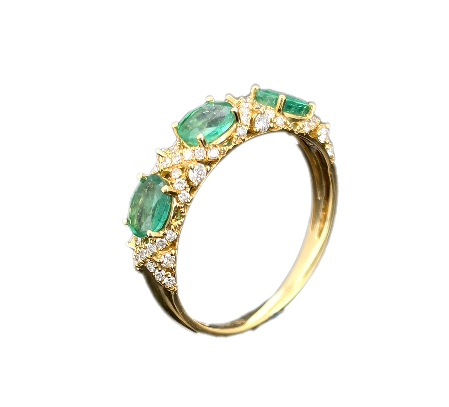 Κομψό μισόβερο δαχτυλίδι από κίτρινο χρυσό, διακοσμημένο με εκλεκτά σμαράγδια και λαμπερά λευκά διαμάντια. Ο αρμονικός συνδυασμός του βαθύ πράσινου με τη διακριτική λάμψη των διαμαντιών δημιουργεί ένα αποτέλεσμα εκλεπτυσμένης πολυτέλειας. Ένα διαχρονικό κόσμημα που φοριέται εύκολα κάθε μέρα αλλά ξεχωρίζει σε κάθε ιδιαίτερη στιγμή.