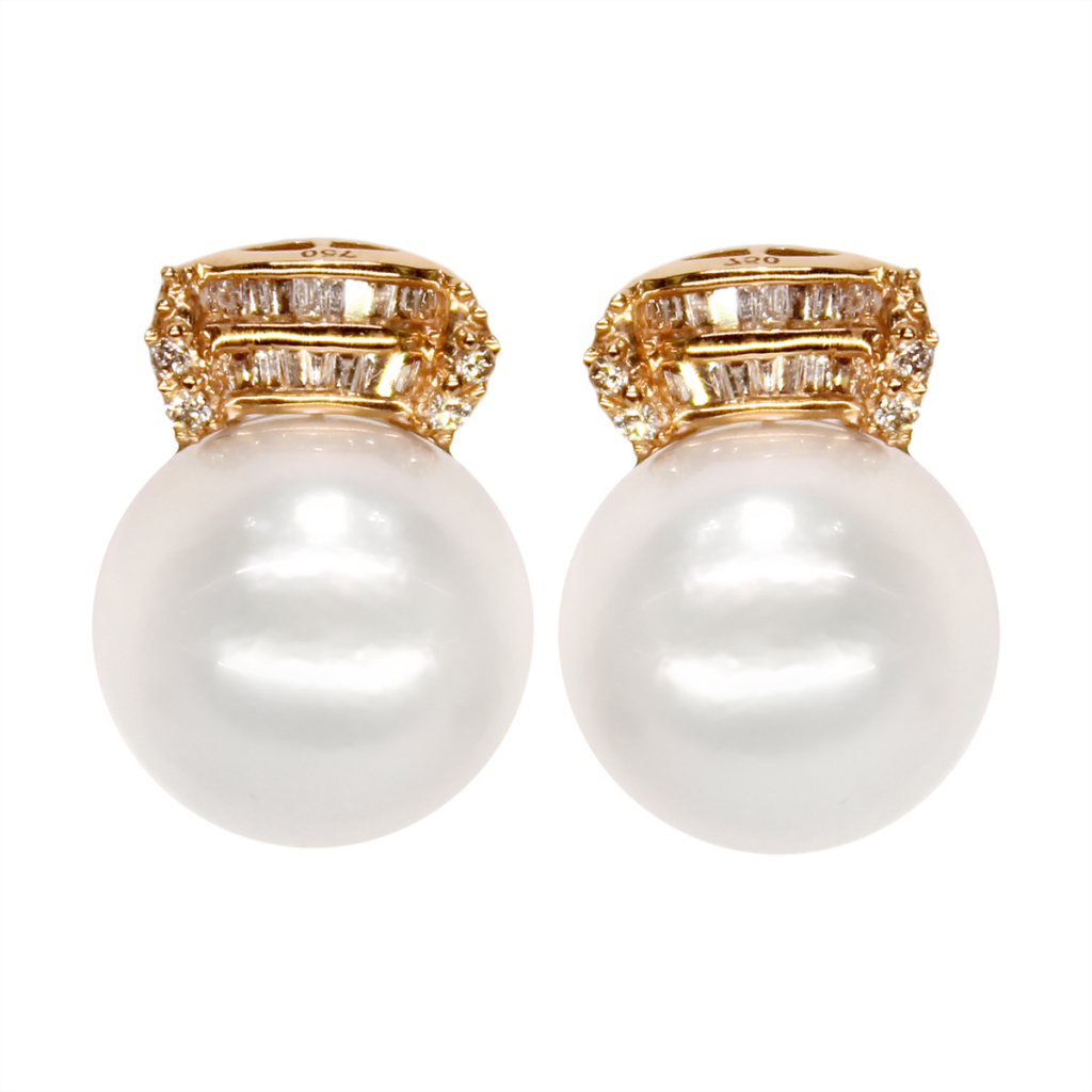 Πολυτελή και θηλυκά Σκουλαρίκια με λαμπερά Διαμάντια σε κοπή μπριγιάν-μπαγκέτες και άψογα Μαργαριτάρια Νοτίων Θαλασσών, πάνω σε 18Κ κίτρινη χρυσή βάση.