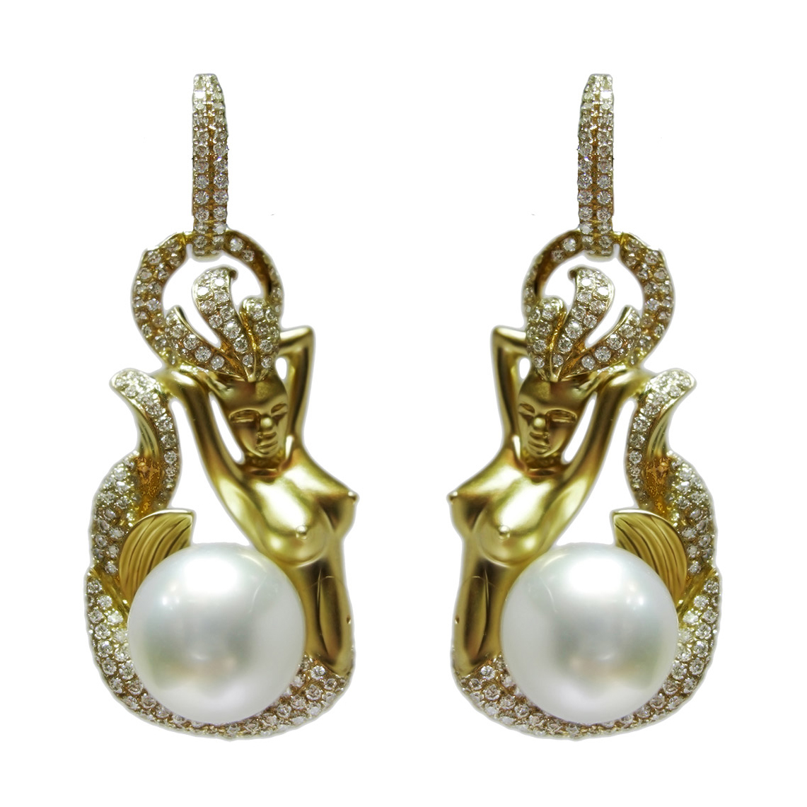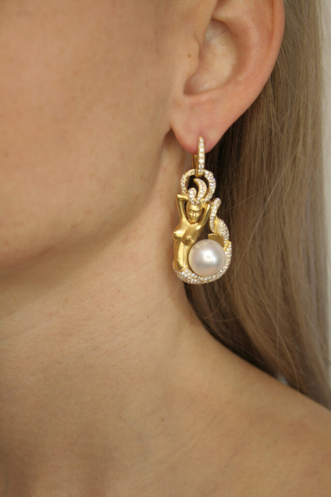 Μέδουσα. Ένα μυθολογικό σχέδιο σε Σκουλαρίκια με εκθαμβωτικά Διαμάντια σε κοπή μπριγιάν, σε συνδυασμό με αψεγάδιαστα Μαργαριτάρια Νοτίων Θαλασσών, πάνω σε 18Κ κίτρινη χρυσή βάση.