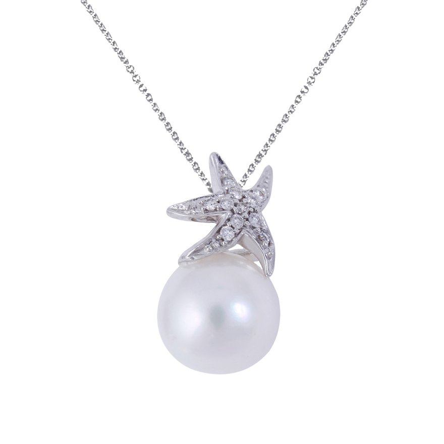Ένας υπέροχος αστερίας Μενταγιόν από λευκόχρυσο 18Κ με αστραφτερά Διαμάντια σε κοπή μπριγιάν και ένα ολοστρόγγυλο λουστράτο Μαργαριτάρι Νοτίων Θαλασσών.